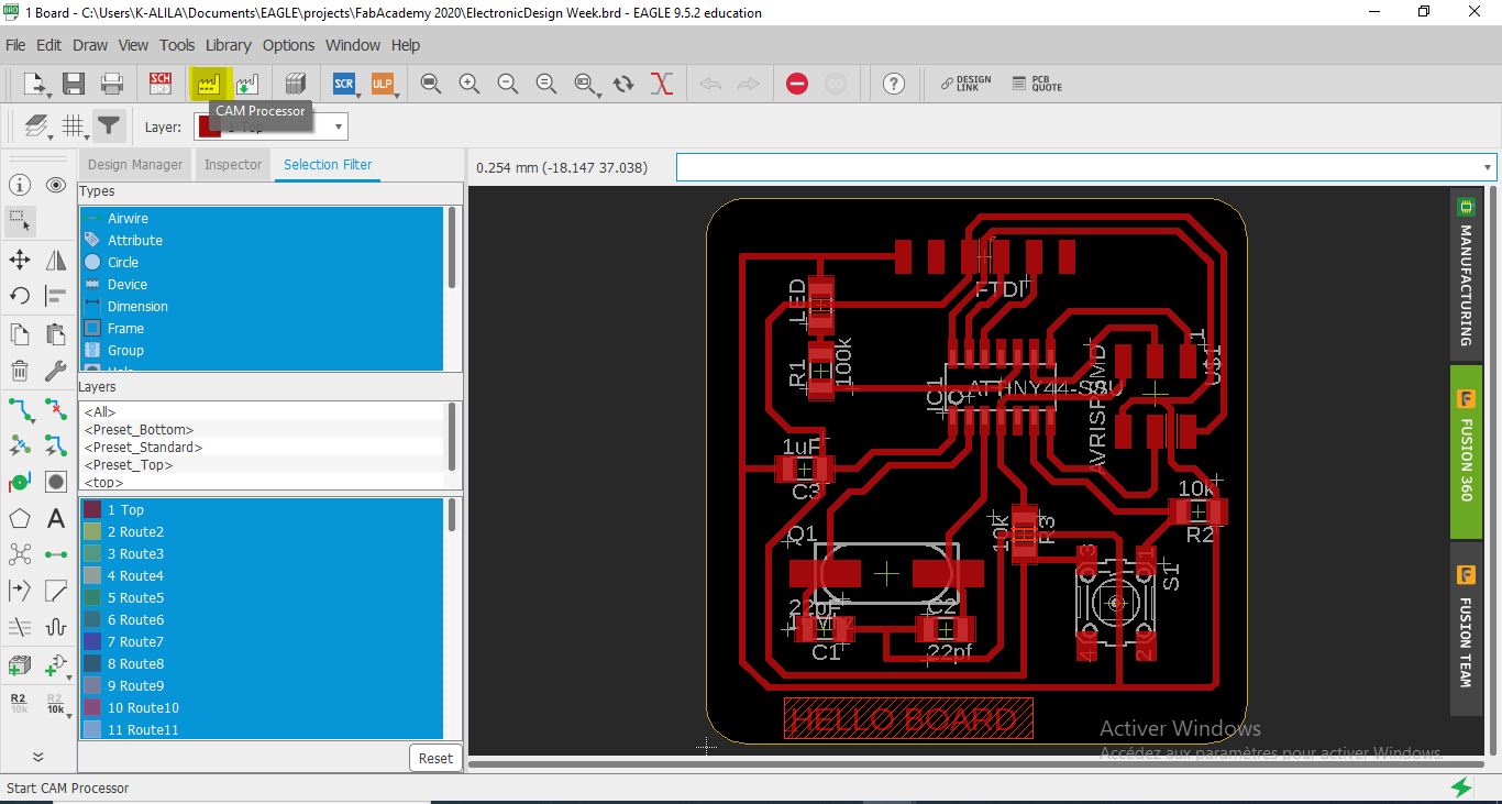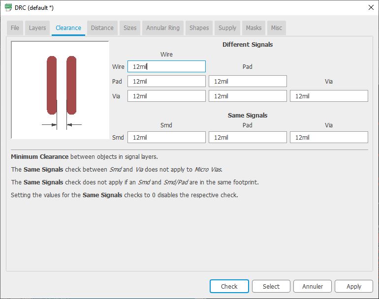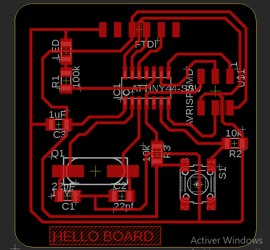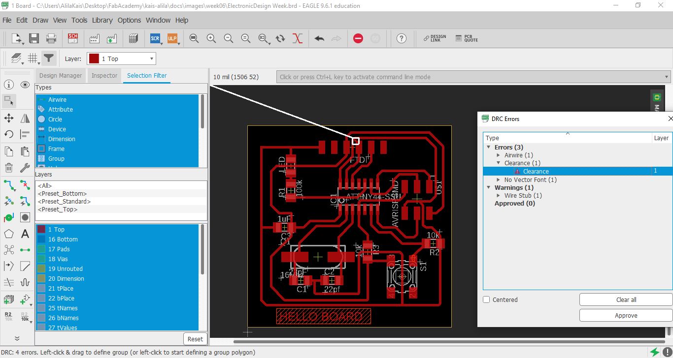 To check my board and make it machinable using the cnc of our fablab, I checked the clearance and every detail of my borad using Eagle design rules: DRC . Using our CNC and the tools availble for now in our fablab, we are able to make 12mil as clearce to have a good quality board as shown in this image.