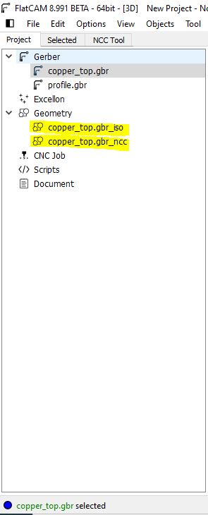 b. Double click on the top copper gerber file of the project manager. here where you will choose te tool diameter and the number of passes for the tracce. You can also use the NCC Tool (Non-Copper Clearing) process to mill the surface where we dont need copper and chose another tool diameter and the milling depth to make the process faster. After all that press Generate Isolation Geometry