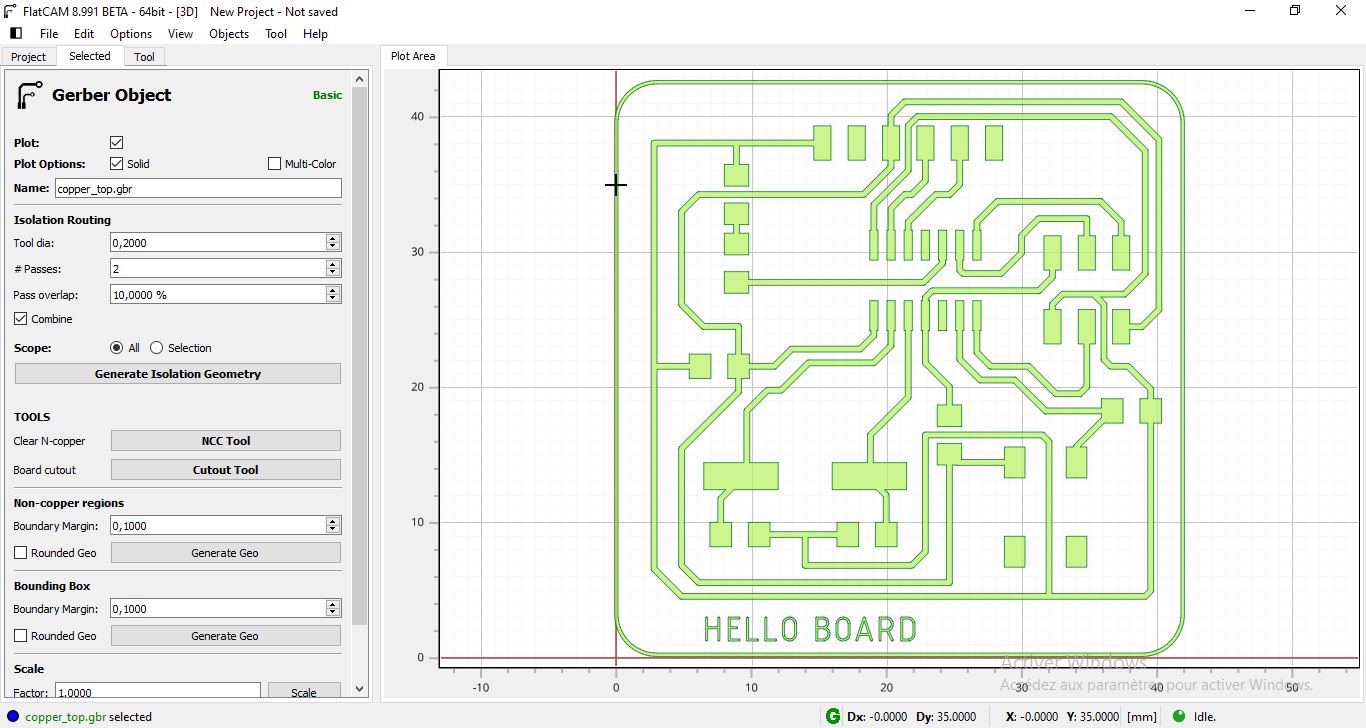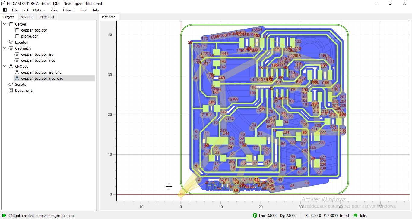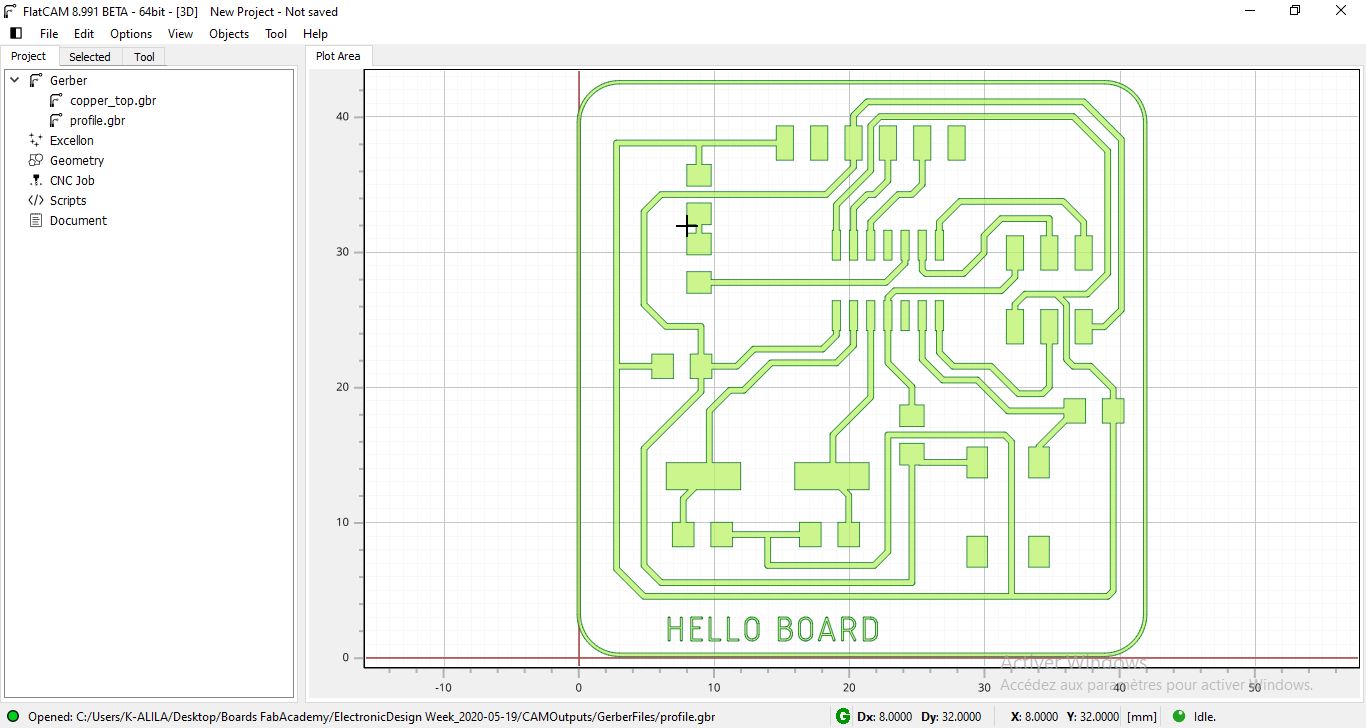 NOTE: To move the trace or the profile, you should select all then move the groupe. Also You should import all the gerber files and the drill file together at the same time before moving because you may lose the correct position of each layer. lat cam postion the layers correctly when you import them all after that you can ove the groupe. If you import the top copper for example and move it then import the drill file you miss the correct position of the drills on the board.
