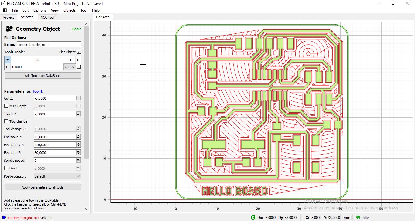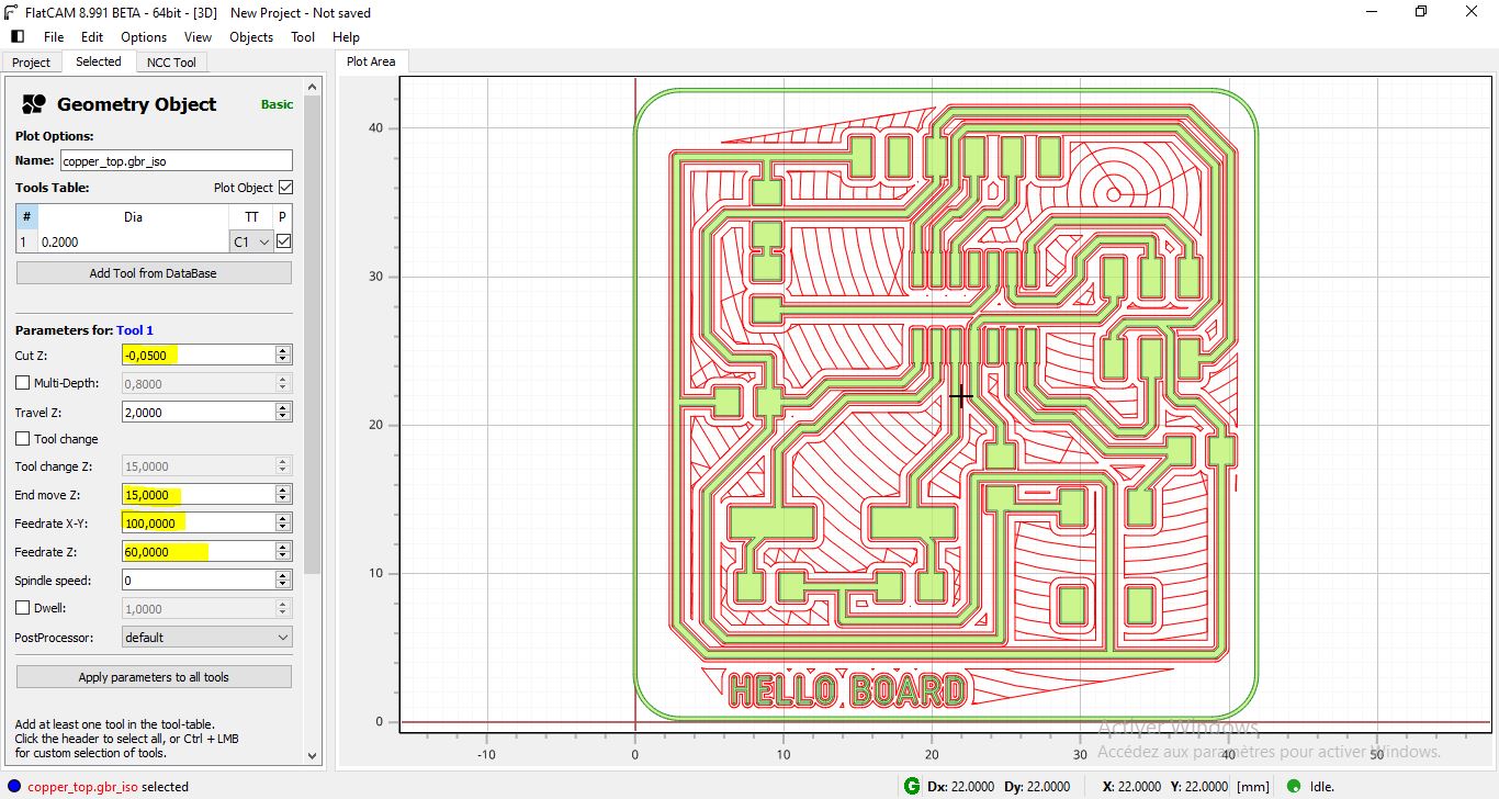 d. The next step is to generate the toool path to have the g-code at the end. Double Click on the Geometry generated on the previous step. and enter the machining settings like the plunge speed, the cut depth , the default speed …