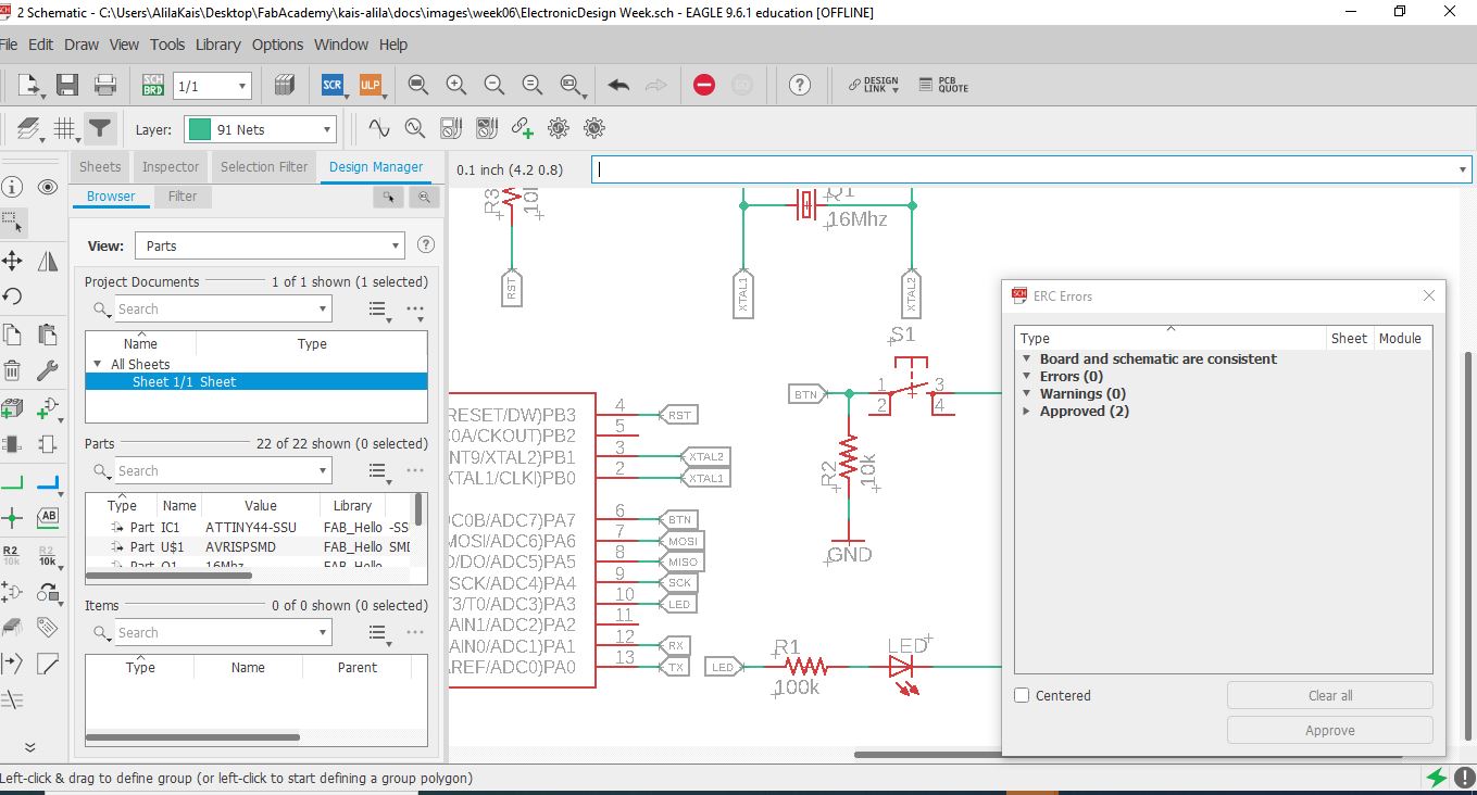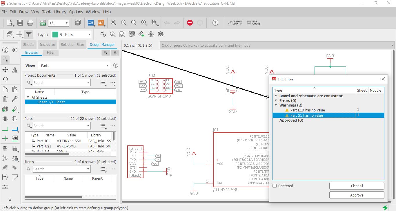 To check my schematics I use eagle feature ERC. This is a handy little tool that you’ll always want to keep in your engineering toolbox, as it helps to point out common errors in your schematic. An ERC will check for the following issues: