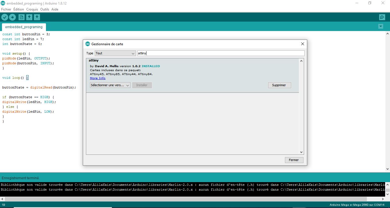 Before start programming The arduino IDE doesn’t recognize the attiny44 in your hello board by default so to fix that I uploaded the one from arduino library attiny by Davis A. Mellis version 1.0.2 from board managment features and intall it. like shown in the image below: