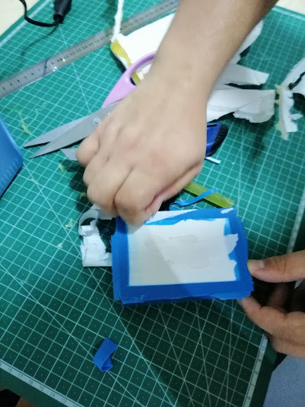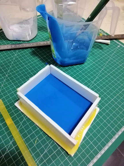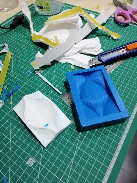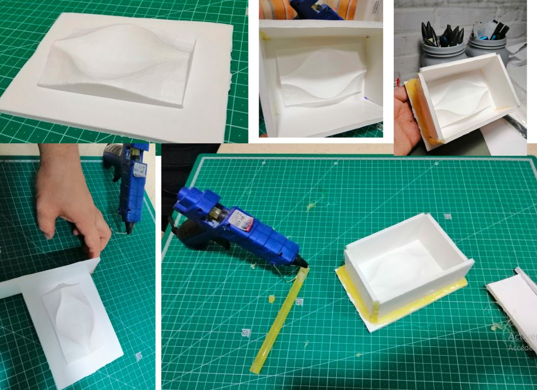 For the 3D printed mold I used some composite paper as shells and limits for the mold. frst, I fixed the 3d printed part to the bottom using hot glue to make sure that it will not move. tha Following an ofsset from the part i attached the shells also using hot glue as limits for the mold.
