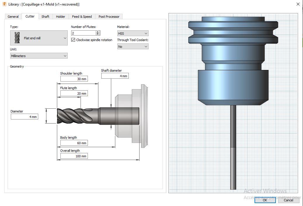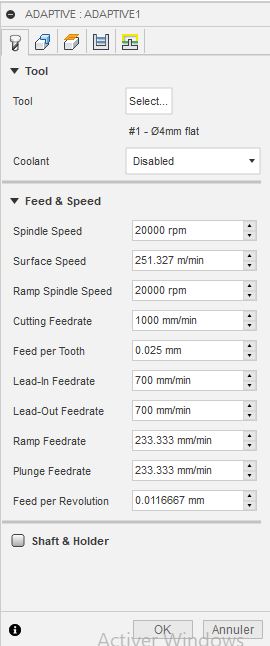 Step 1: Roughing Job I am using for that a Flat endmill, 2 flutes, diameter 4mm and 100mm long for rough job. Adaptative Clearence
