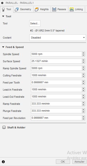 Step 2: Finishing Job I am using for this process a Trapred endmill with 1.6mm the round end and 6m shaft diameter. Parallel finishing strategy
