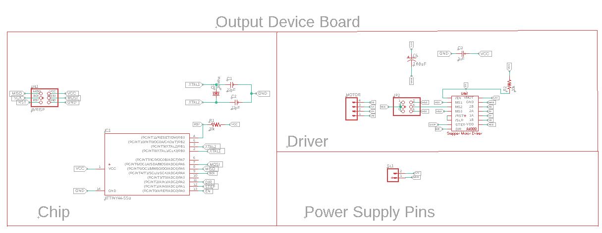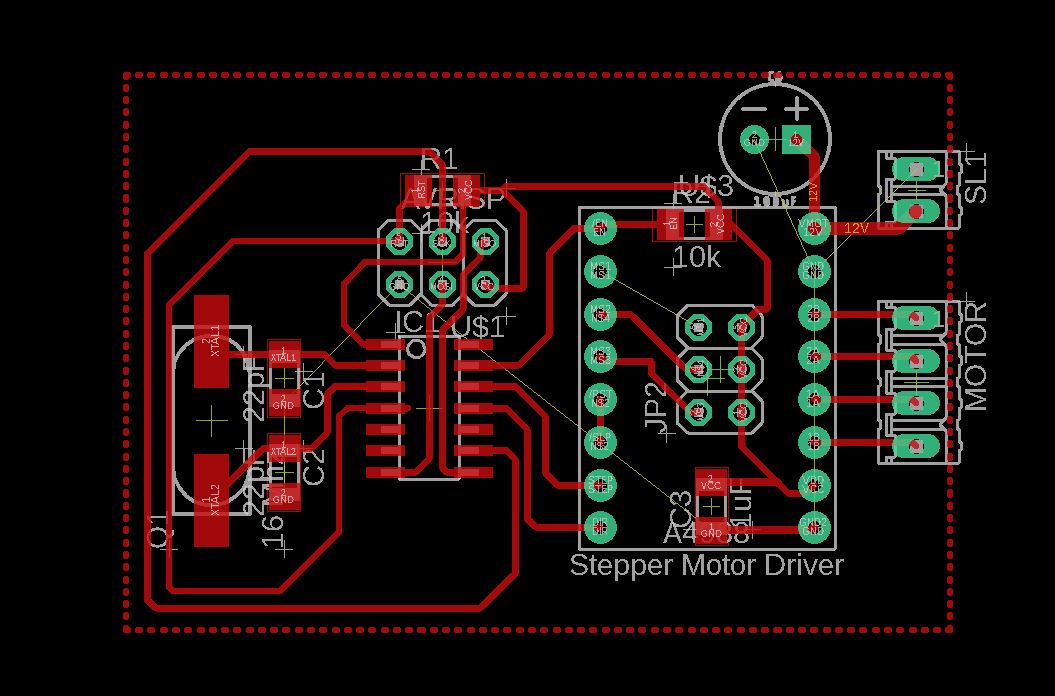 Components: * x1 ATTINY44-SSU * x2 22pF Capacitor 1206 * x1 1uF Capacitor 1206 * x1 100uF Capacitor 1206 * x1 16 Mhz CRYSTAL * x2 10k resistors 1206 * x1 M02 pin connector * x1 M04 pin connector * x2 2x3 PinHeasd (for the driver and for the AVRISP) * x2 2x3 PinHeasd (for the driver and for the AVRISP) * x1 A4988 driver