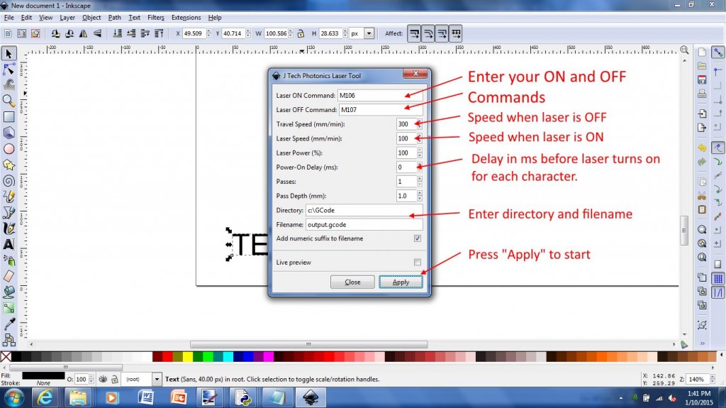 The first test for the machine was generated using inkscape and JTP laser tool plug-in realy usefull and easy interface & the g-code generated is compatible with plotter functions.