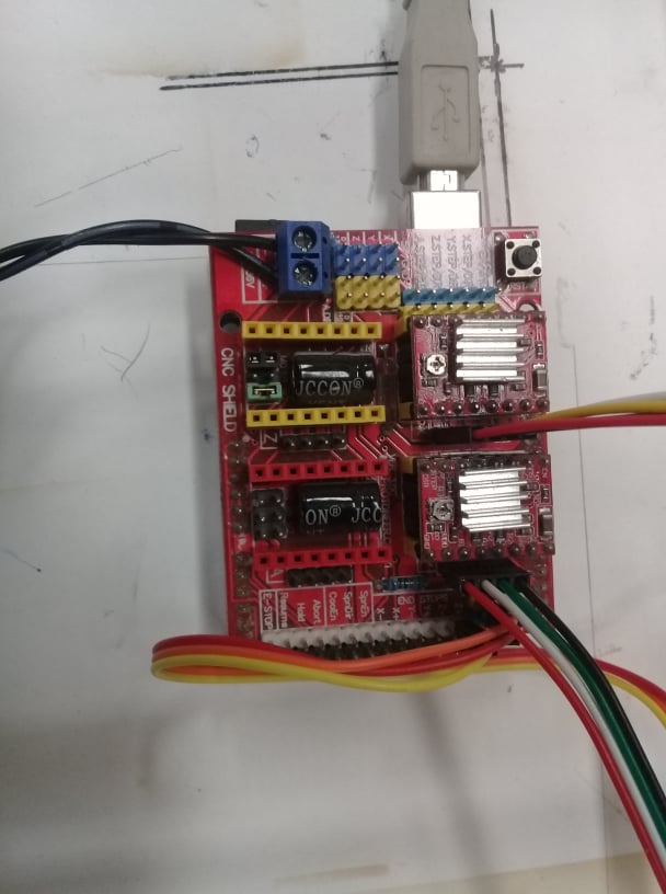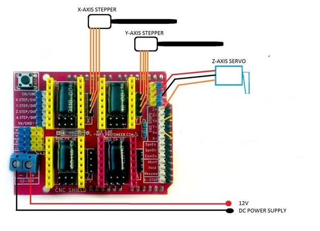 So for our machine we need an arduino Uno and a cnc shield , 2 motors and 2 A4998 drivers and a servo motor.the following figure will show the circuit to be made. Of course the CNC shield will be mounted on the Arduino.