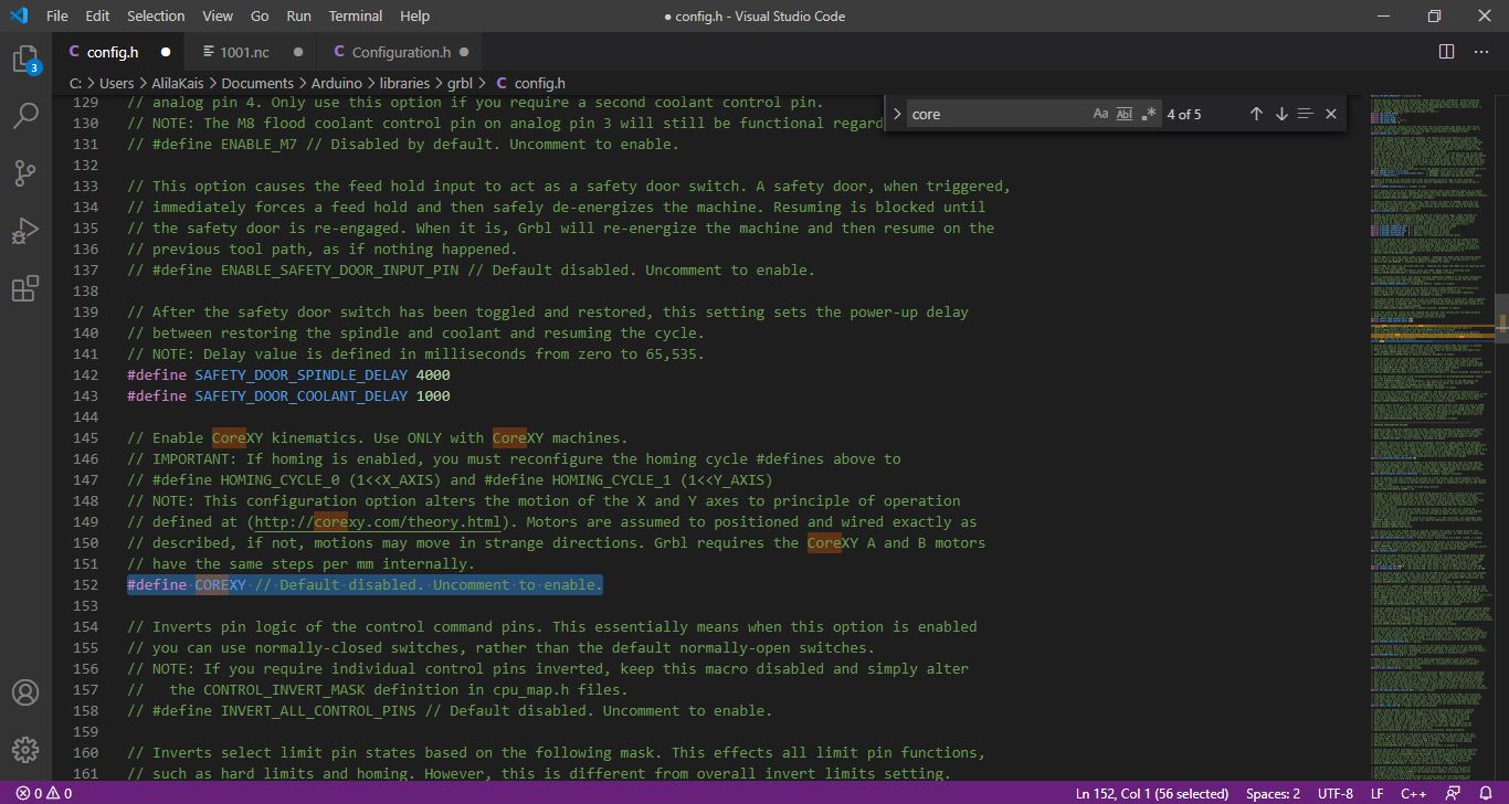 The software we used is GRBL which is a very good open source software to control CNC. For this project We used CoreXY system so the first step I ve done is to change in config.h in grbl folder