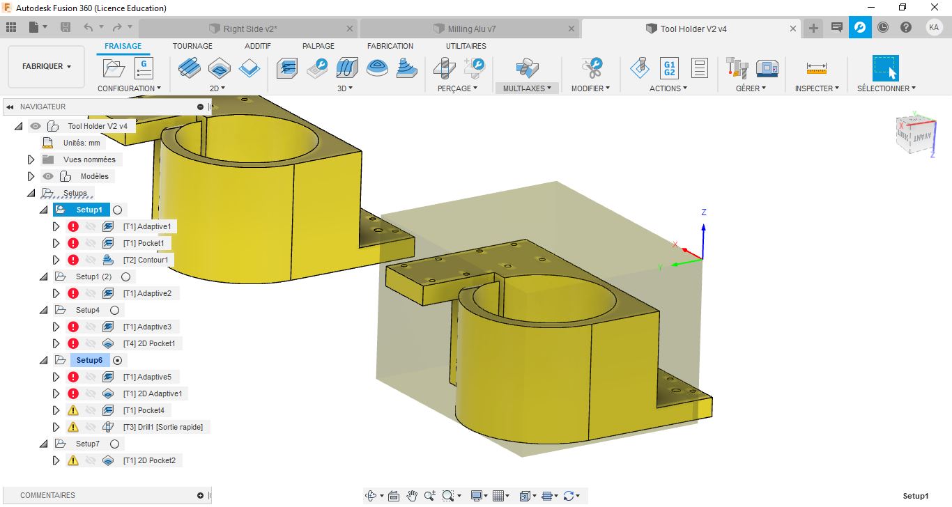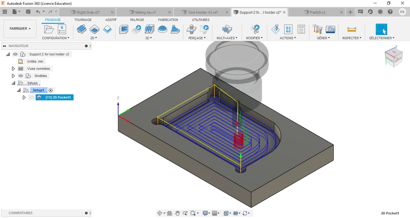 The tool holder is the most complex part to mill. It will be milled in two phases, one phase from the top and another from the bottom.