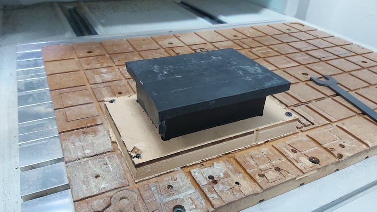 Before milling the POM stock I milled first a support piece made from MDF which will guarentee the position of the stock, all that is due to the difficulty to fic the POM stock using double tape. The support is a 16mm Mdf thickness and I did a pocket milling to fit the stock and with super glue and double tape i fixed the POM stock to the support. All this is done o give the Stock the ability to resist to milling forces.