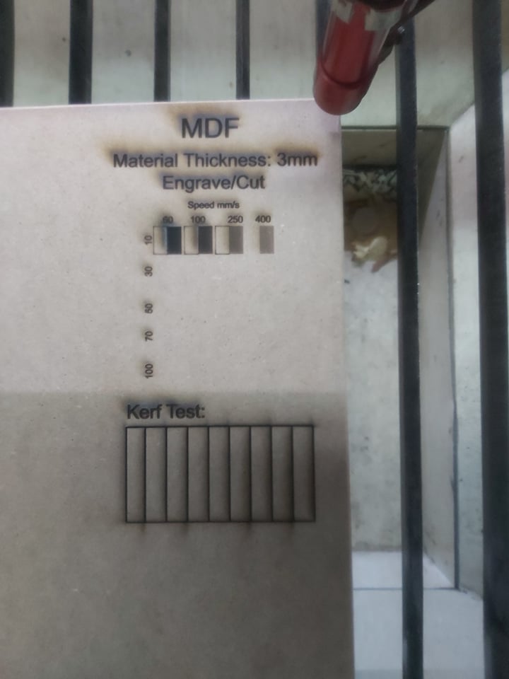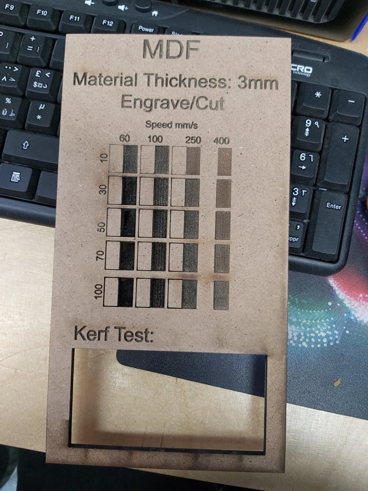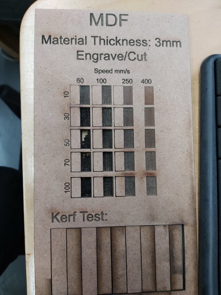 -Characterize your lasercutter,’s focus, power, speed, rate, kerf, and joint clearance.