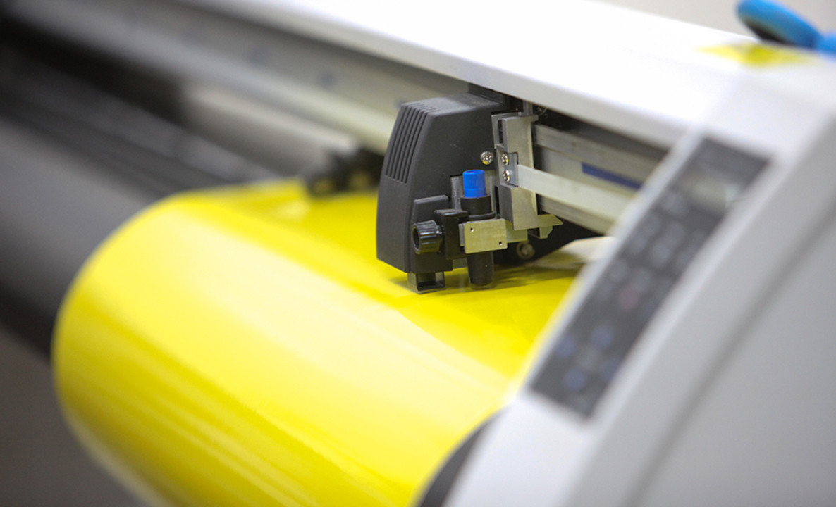 The vinyl cutter uses a small knife to precisely cut the outline of a picture into a sheet or piece of vinyl. The knife moves side to side and turns, while the vinyl is moved beneath the knife. What results from the cut process is an image cut into the material.