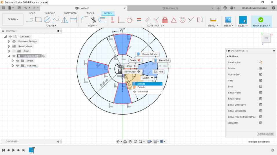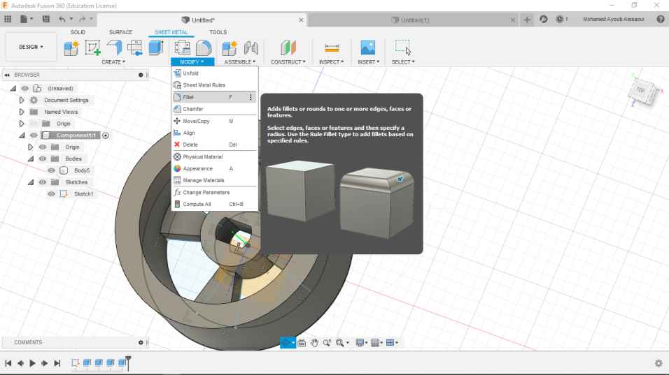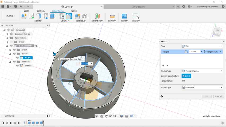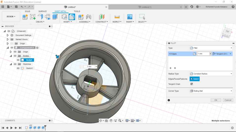 3- After that i used the extrude tool to add depth for my design parts then for the beauty of the wheel i used the fillet tools: