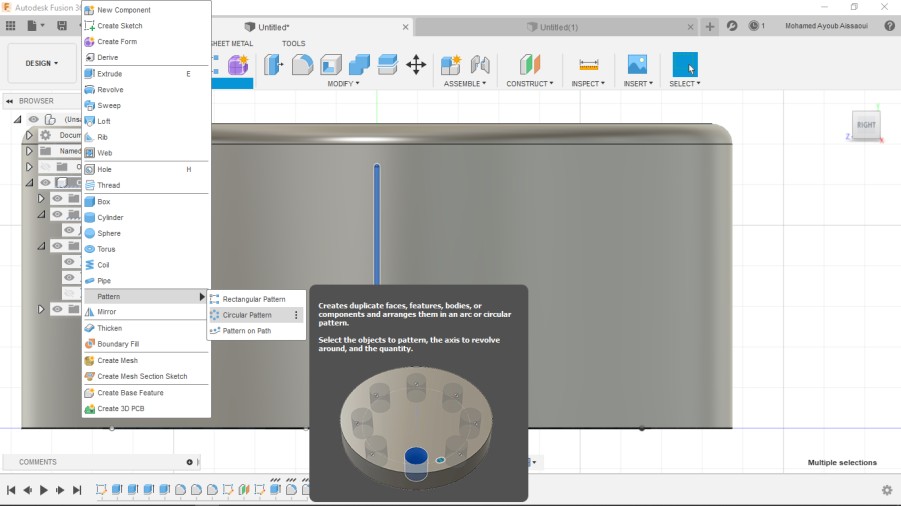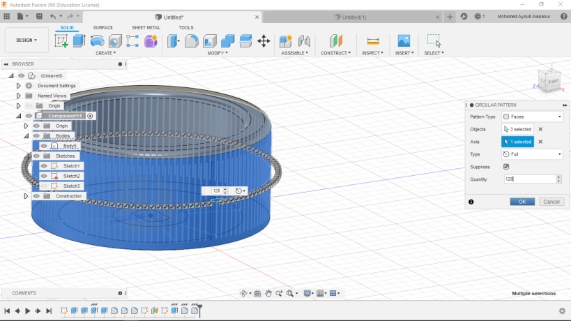 5- As well as the extrude opperation finish , i used another tool for the recent shape which is circular pattern to duplicate it around the body :