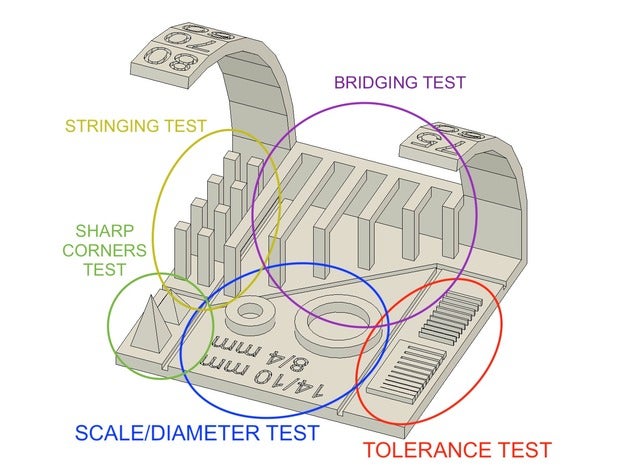 This test contains : overhang test, bridging test, stringing test, sharp-corner test, tolerance test, and scale test (diameter test) as it shown below :