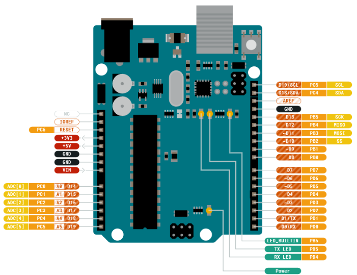 - ATmega328 comes in Arduino, which helps the users to code the program in Arduino instead of assembly or other controller languages. Arduino is popular because of its vast online data and high-level language, and this helps the developer to code the controller program in Arduino and them convert it into the microcontroller code. In case of Arduino the pin configuration for the controller will be the following: