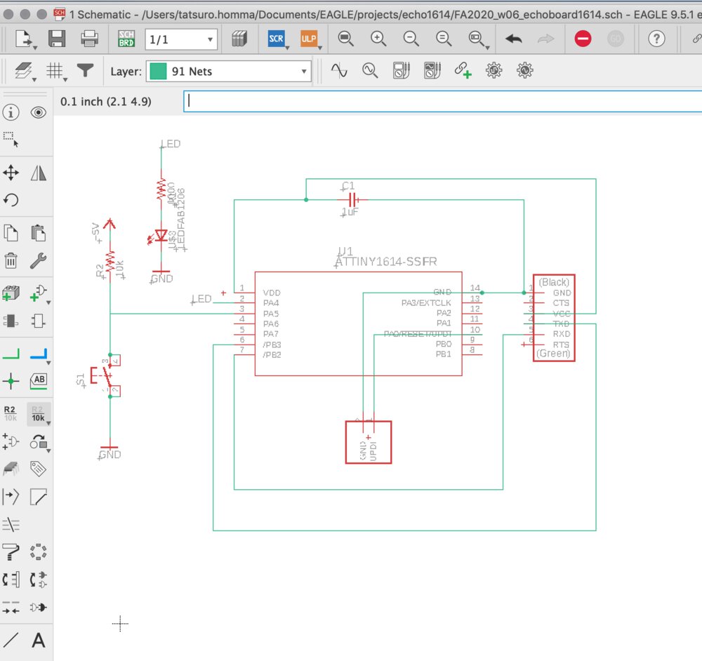 The original echo program returns the message starting from "hello.t1614.echo: you typed ". I did not need these messages as I wanted to check simple in/out and how the ASCI character is displayed in oscilloscope.