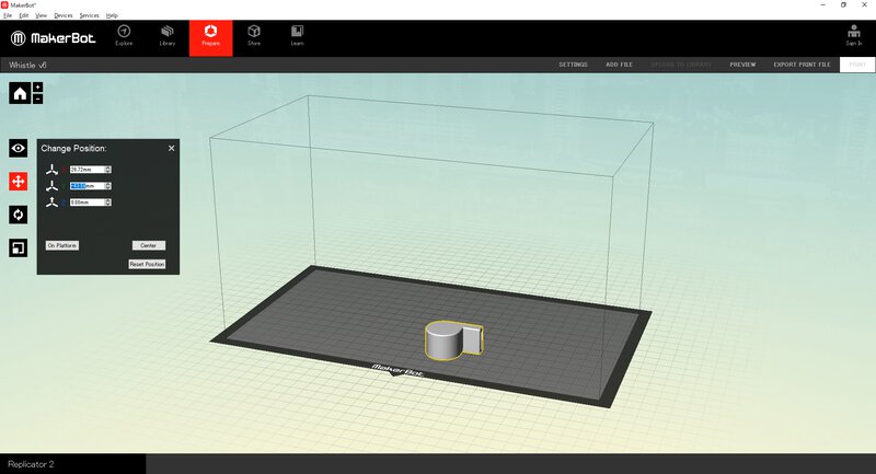 Considering 1st Trial above, I should re-design the pillar thickness supporting the ball inside of the whistle. With doing that, I just tried to print the same data with 1st trial by the other material, ABS, from the other printer, Maker Bot.