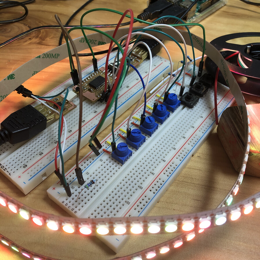 Then I wrote test code that controls NeoPixel behavior by 5 potentiometers and 3 switches.
