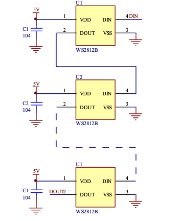 Because the circuits of voltage, ground are linked and the data transffer circuits are cascaded over multiple LED, we only needs one pin(PIN3 in this example) for controlling the device.
