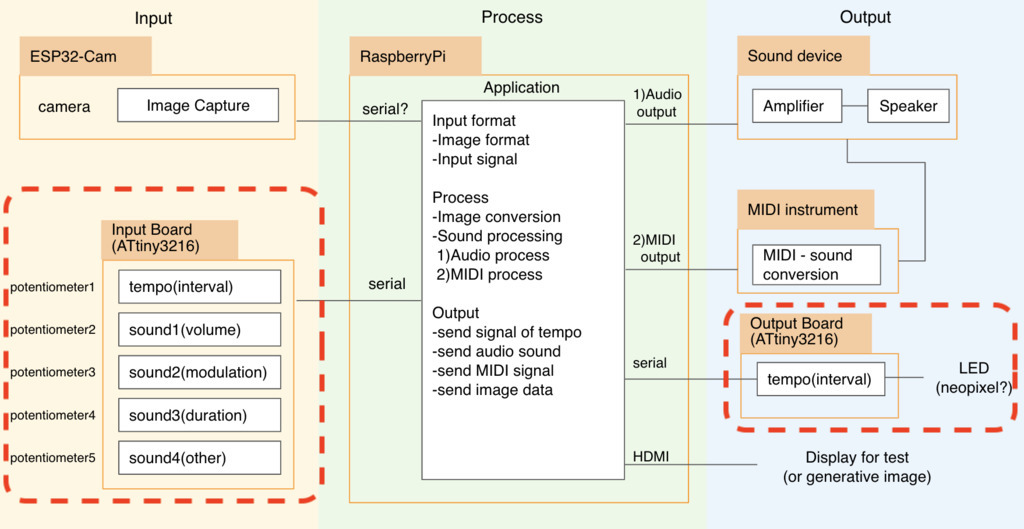 To avoid making too large system, I prefer to make one board for input and output devices altogether using ATtiny3216 microcontroller.