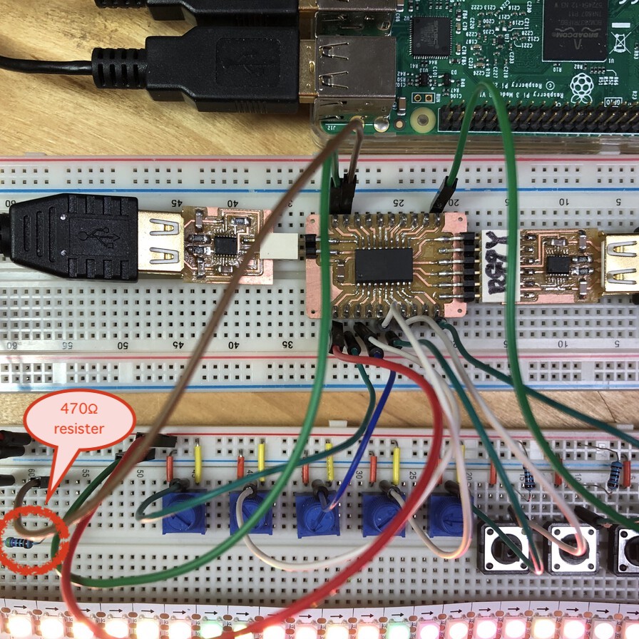 I setup RaspPi(with camera module), Input/Output board(Attiny3216 breakout board + potentiometers, tact switches and NeoPixel on breadboard).