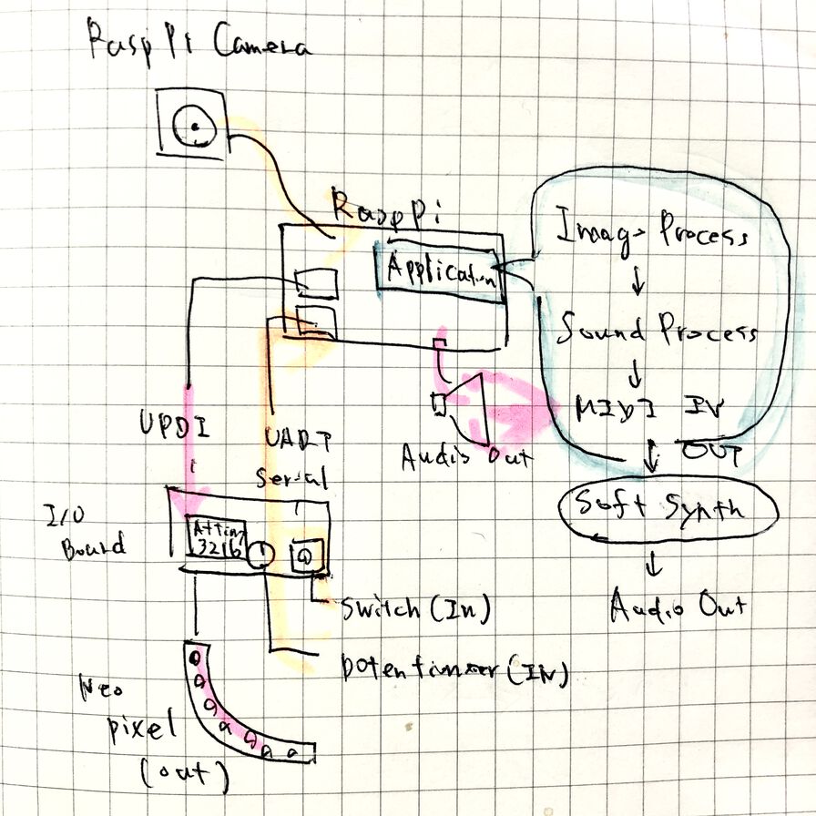 I implemented image processing application by python3 on Raspberry Pi that interfaces with ATtiny3216 input-output board that I made in week11 (Output device). I have small experience playing with python, but I'm new at image processing, serial communication or thread programming etc. Learning many things from internet, I built codebase at least for an experimental use. Followings are points of coding ideas that I tried.
