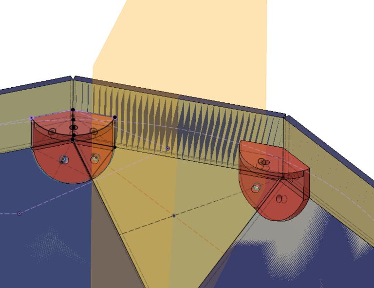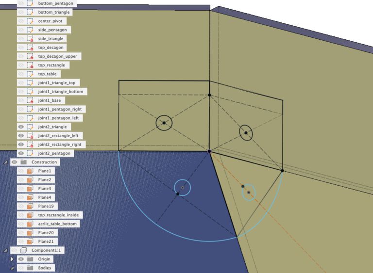 For joint to attache top decagon wall and acrylic table, I simply sketched to the bodies to be fixed and created screw hall.