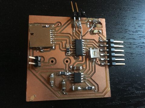 Here is a prototype single sided board that is already milled and houses the SD card holder, amplifier, AtTiny 1614, audio outputs (missing microphone input).