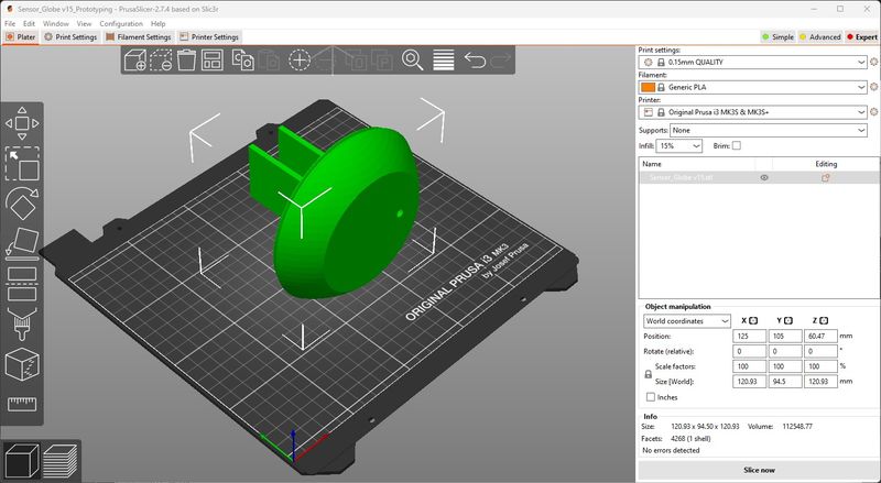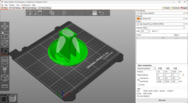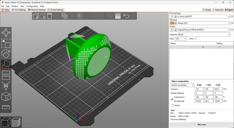 The ThermoSphere was in my mind’s eye, but making/designing the globe was a challenge. So I used the internet to search in Thingiverse.com for “sphere clear pla” because that was what I wanted and the material I intended to use. I got some really cool results, but the best was the Phillips Hue Globe Diffuser. THAT IS IT! I can work with that! So I researched a little bit. Turns out the author, ApatheticEnthusiasts (Robert Barton), did some research too. He summarized as, “This is a remix using parts from two things: Bottom and Top.” Eventually, I ended up with Fusion 360 design files from Abditus2 called the Sensor Sphere Box and the method of designing exactly what I need.