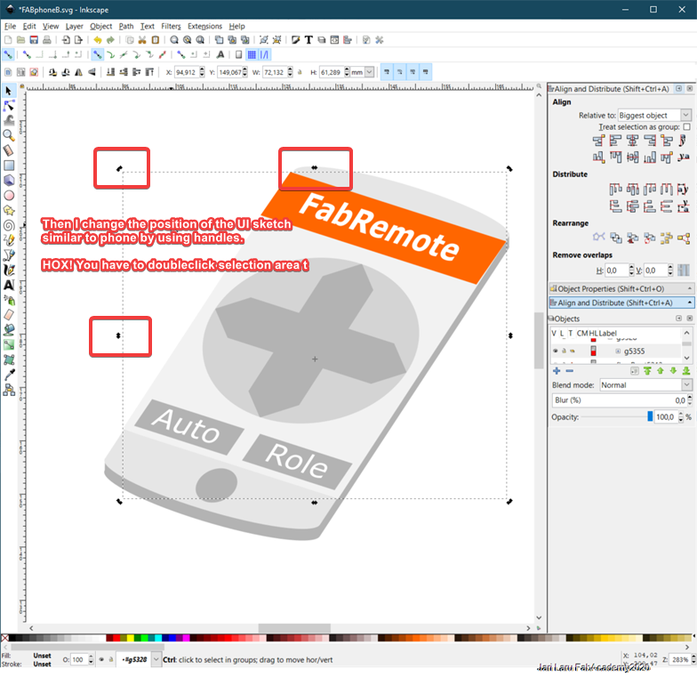 I didc continue by grouping all created objects by selecting them and then using "Object/Group" function from the menu. Then I did changed handles from scale to rotation by clicking object once. Then I was able to change orientation of the phone just dragging handles.