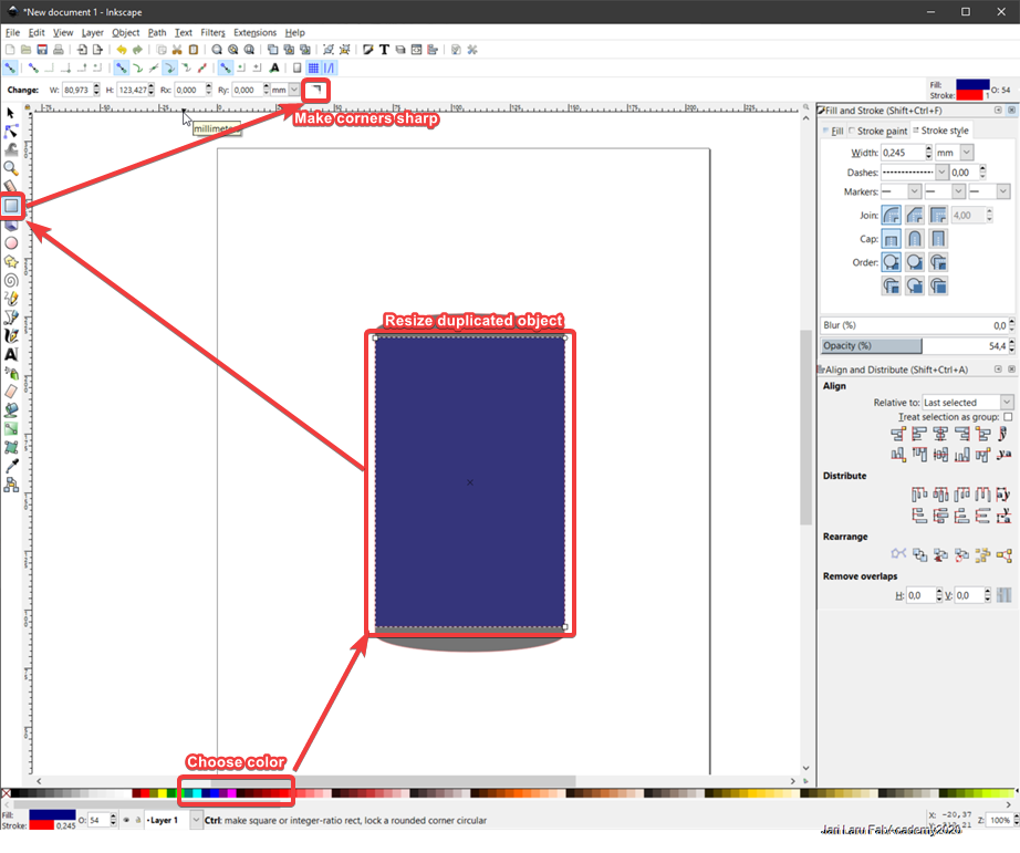 Next, I resized my duplicated object by using handles on the edges of the object. It was done to make space for "home button". Also color was changed into black (from color swatches below the user interface) in order to show the space of the phone display ;). In addition to that, I also removed stroke color in order to get rid of border colors.