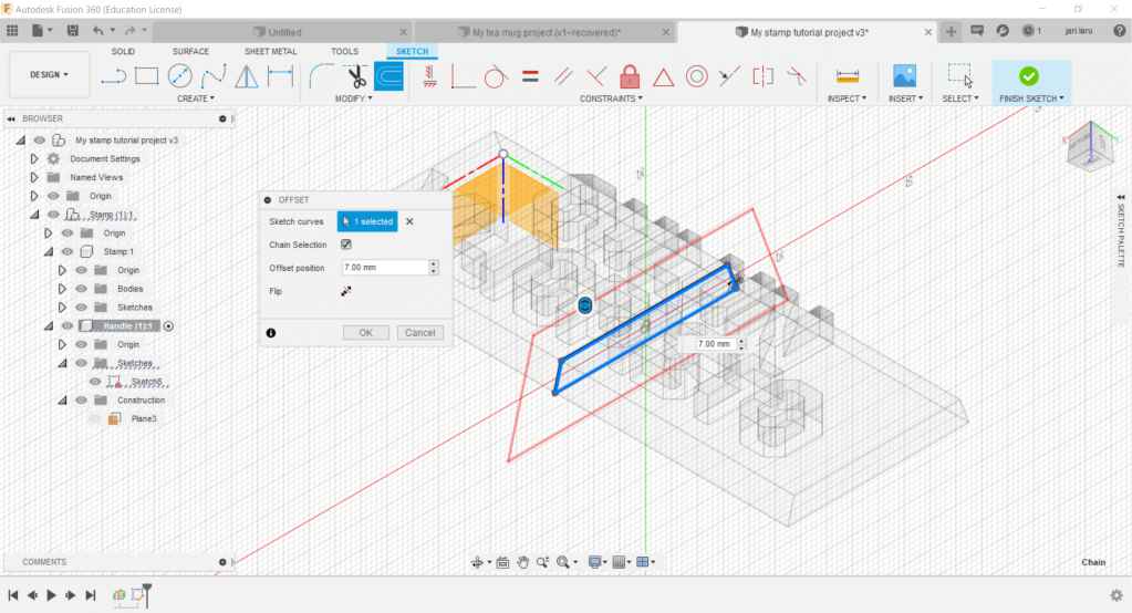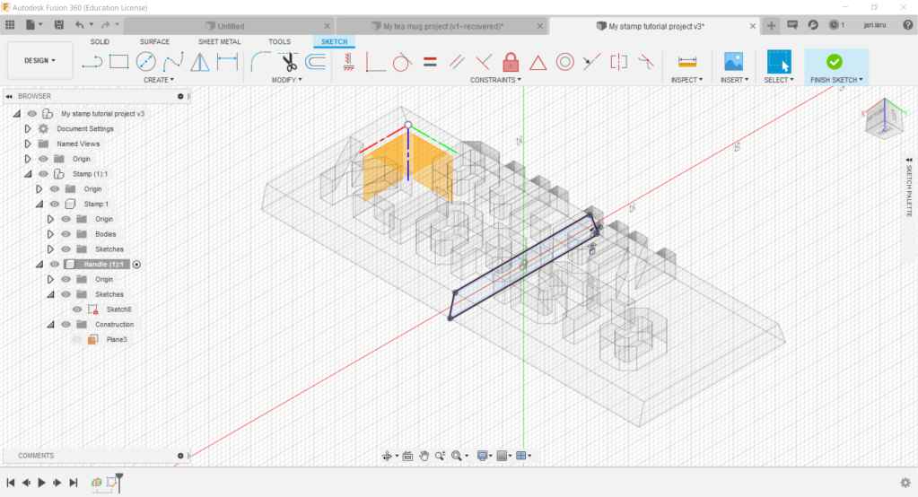 I also did think about my possible final project, but I found good idea just on tuesday, a day before wednesday meeting. So, I decided to do my 3D modelings time to learn basics of Autodesk Fusion. I did two tutorial projects by following Youtube-tutorials: a) Coffee (tea) cup and b) Stamp with handle. That approach was good, because I really did learn how to use software and enjoyed it a lot. I also evaluated how easy it's to learn, because I may use Autodesk fusion on my courses in Teacher Education.