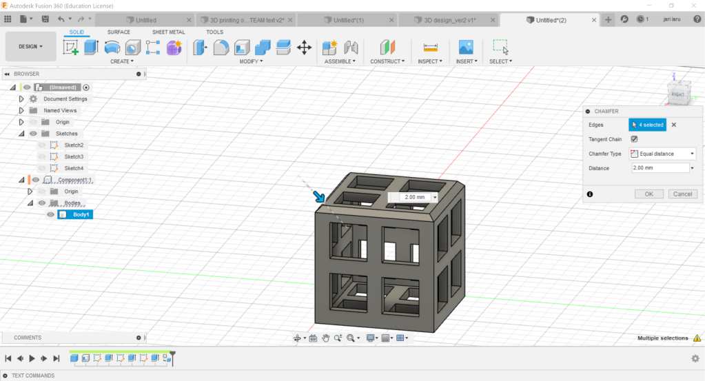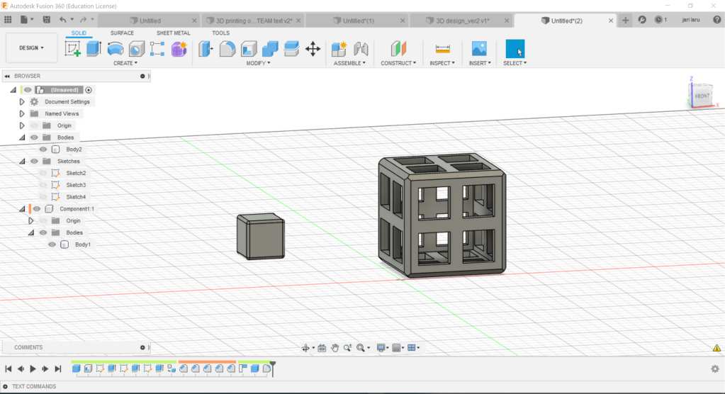 In this task the aim was to design artefact, which can be manufactured only additively, meaning an object that could not be milled or laser cut. For this, I chose to design a cube inside another cube. Additive manufacturing is designing by layering components whereas subtractive is when layers are cut from a design until the desired model. The design outlined below is only possible to fabricate using additive manufacturing because the inner cube’s dimensions are slightly bigger than the holes on the sides of the bigger cube, the two cubes are not attached, the smaller cube moves freely inside the bigger one and it can’t come out through the holes.