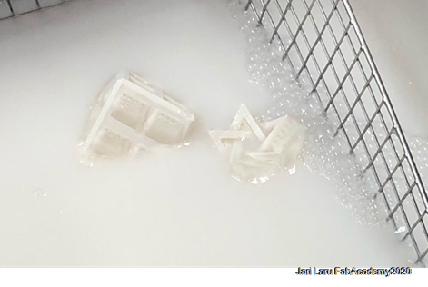 Artefact printed with Stratasys printer needs normally overnight treatment in that liquid, but if the desin is bigger, then time requirement can be also higher