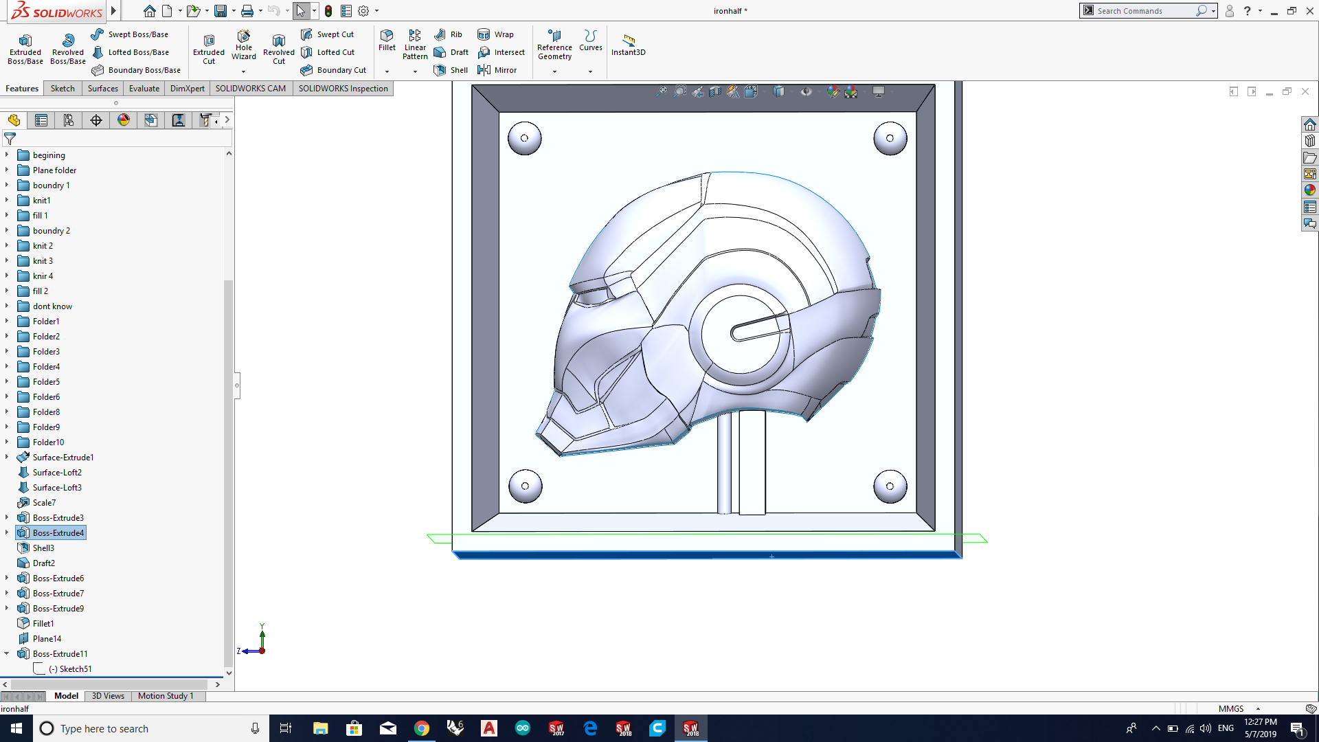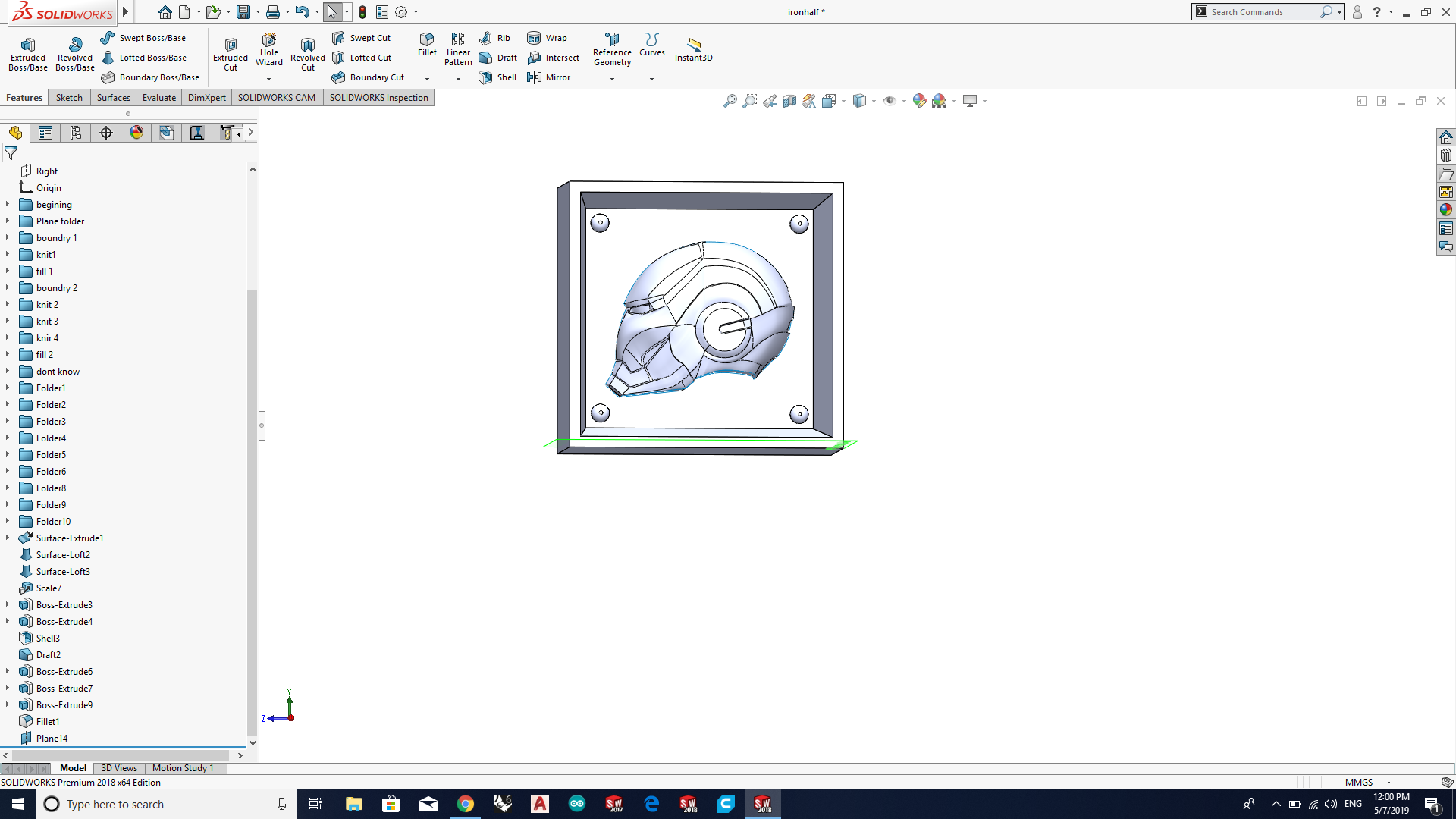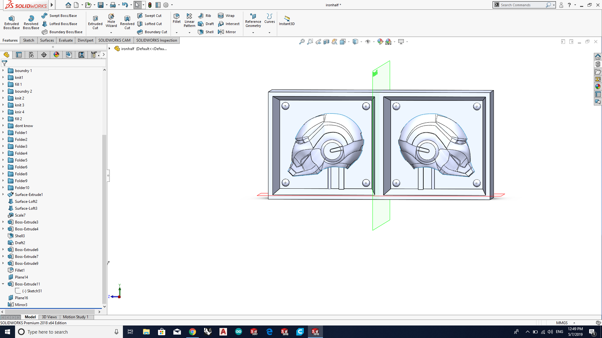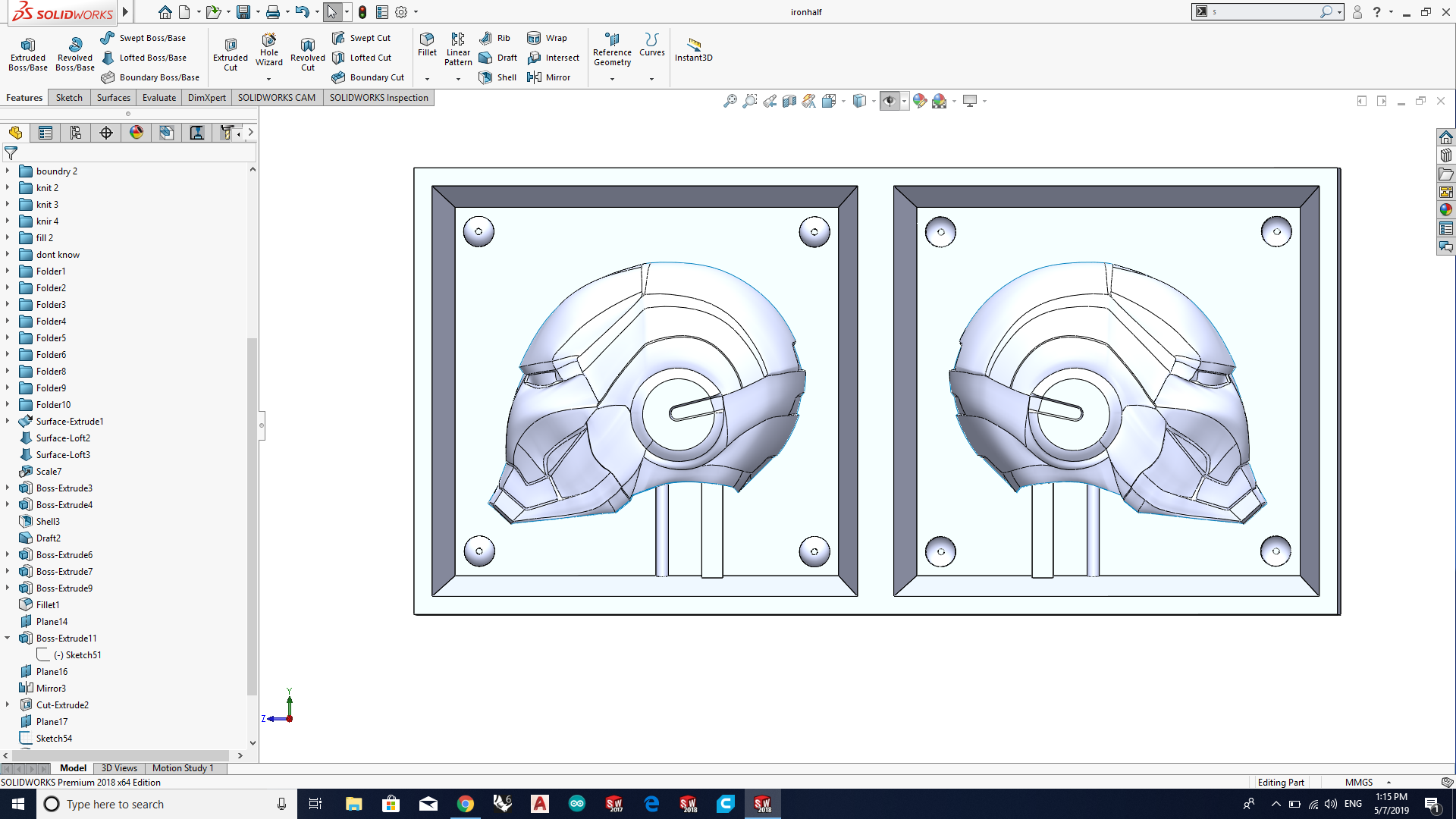 1- I got Iron Man's helmet design file for the helmet from GrabCAD as a solidowrks file. I imported the file to SolidWorks and cut it into half with the help of one of the Fab Engineers at QBIC Fablab.