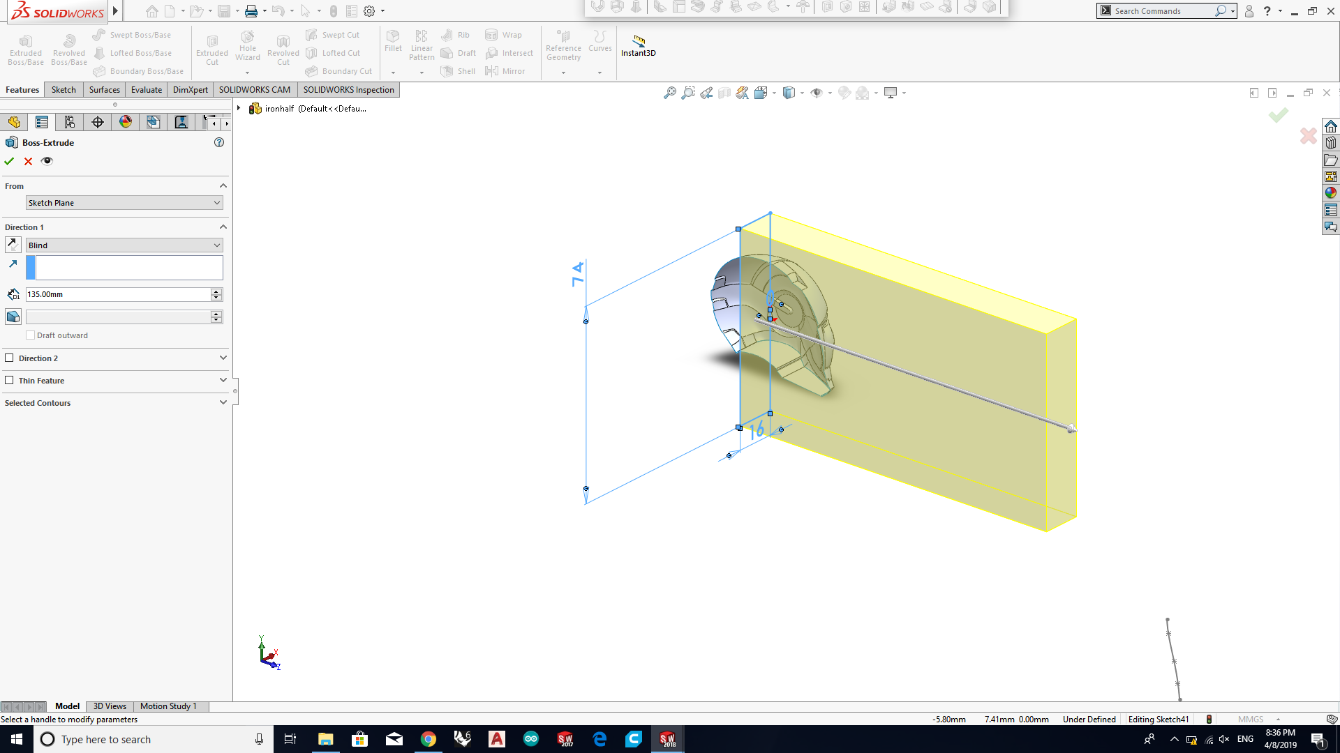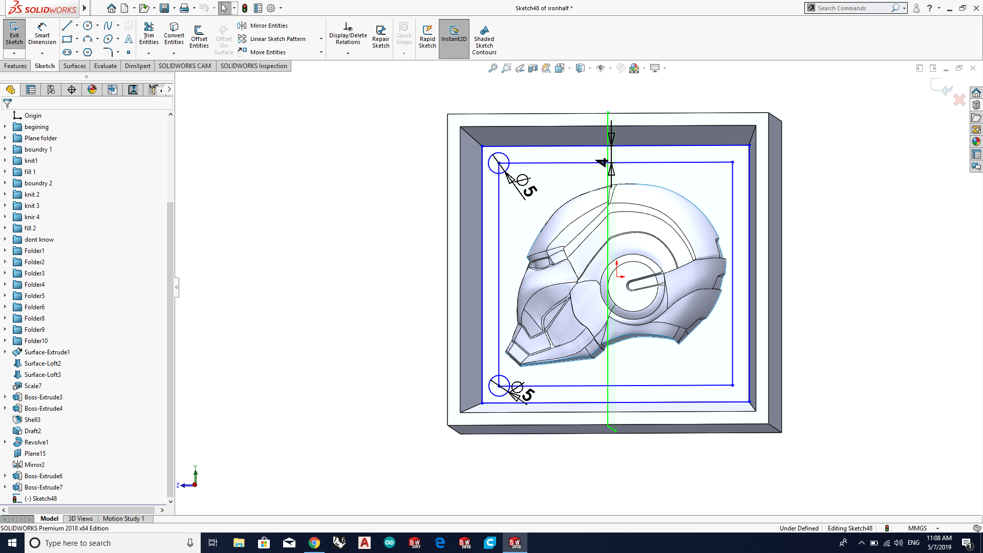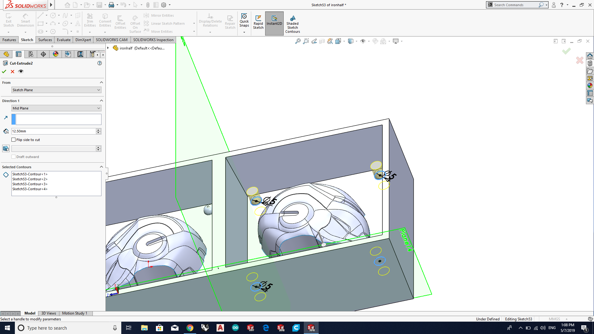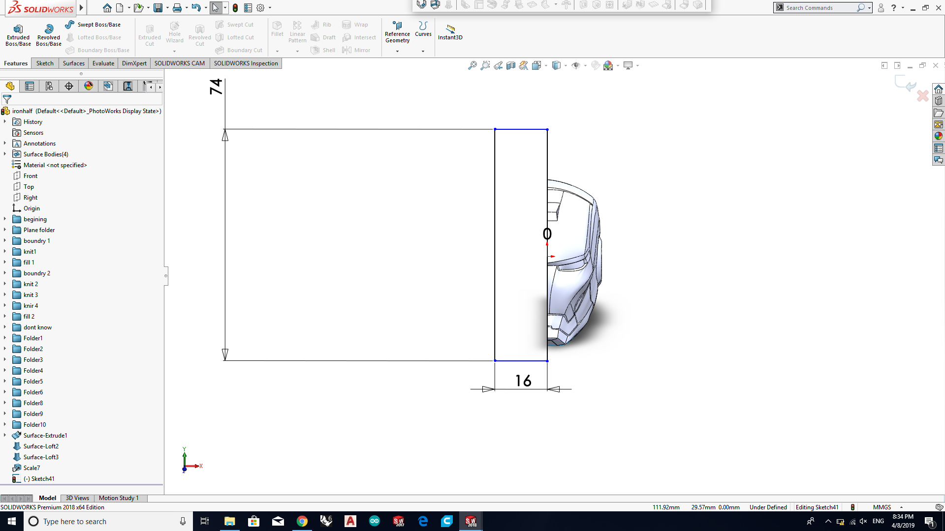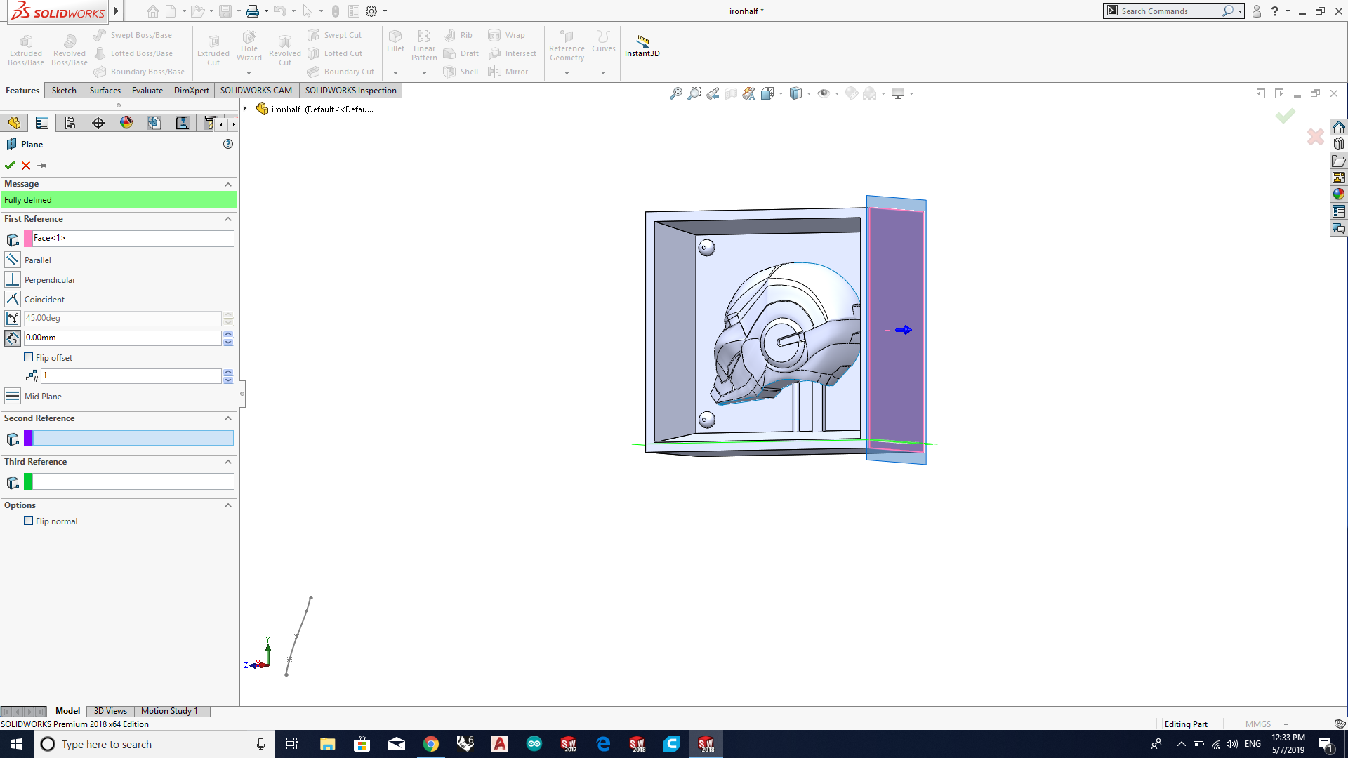 1- I got Iron Man's helmet design file for the helmet from GrabCAD as a solidowrks file. I imported the file to SolidWorks and cut it into half with the help of one of the Fab Engineers at QBIC Fablab.