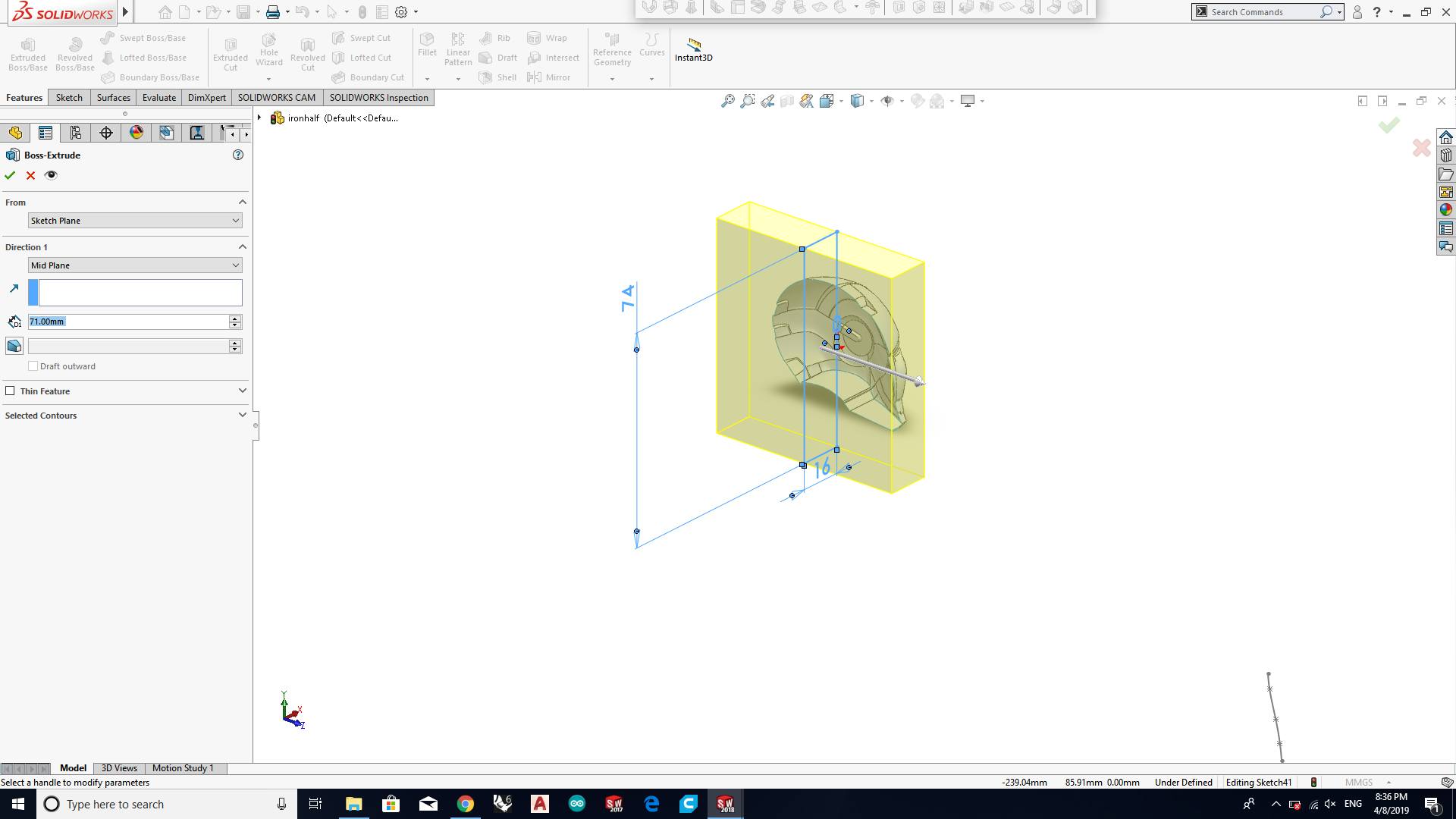 4- To make sure the my design is in the middle of the rectangle, I changed the direction of the extrusion from blind to mid-plane and then I set the depth to 71 mm