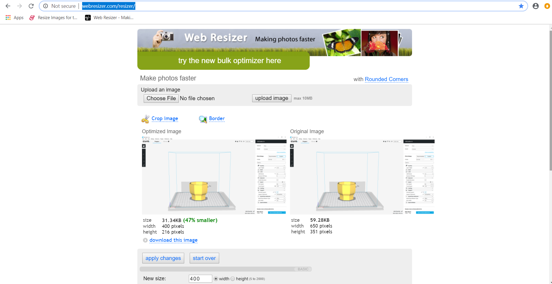 Therefore, I used Webresizer.com which is an online image optimization tool that it is easy to use and there is not need to download it. I mainly used it to resize images and screenshots that are simple and don't have a lot of details.