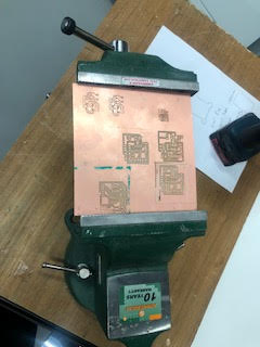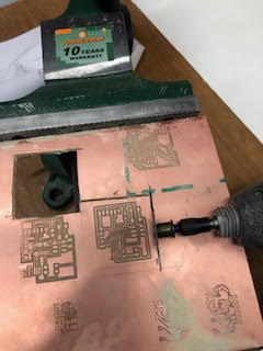 In this trial, I didn't use the 1/64 bit to mill but instead I used a tool called V-tool which is a milling tool that comes with the machine because the 1/64 bit was broken and I didn't find another one. As shown in the picture below, the board may look good at first sight, but I noticed there were short circuits. My interpretation is that the V-tool isn't able to mill accurately when it comes to traces that were relatively close and I noticed that some of my collegues faced the same issue. Therefore, to resolve this issue, I got the 1/64 tool and used it in the seconde trial.