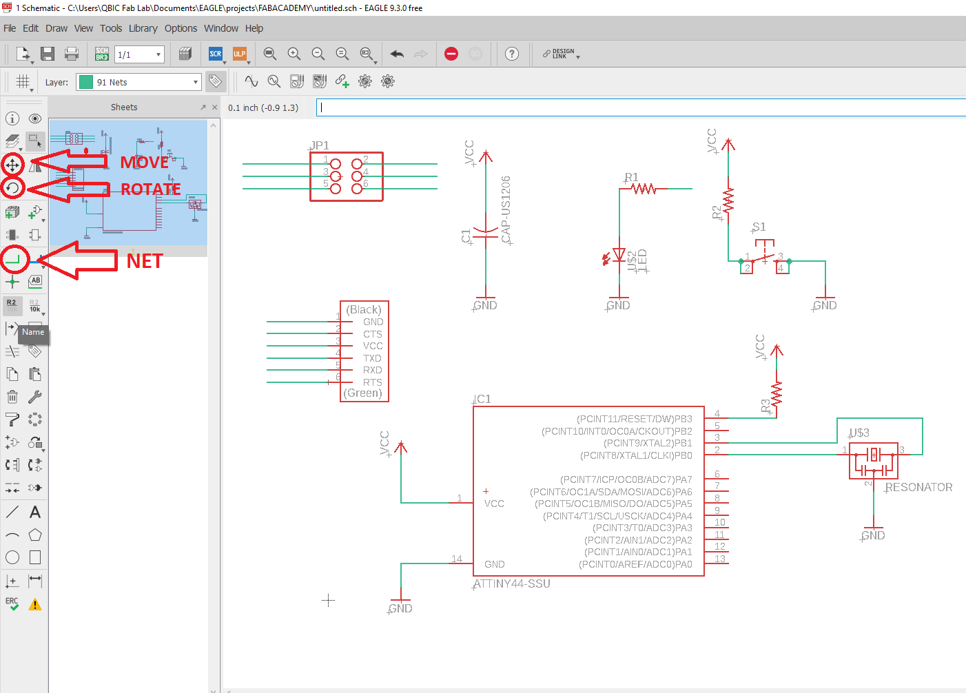 5- I started connecting all the components using teh "Net" tool from the toolbar on the left. To make sure that the schematic is clear and organized, I used the different editing tools from the left toolbar such as "Move" and "Rotate".