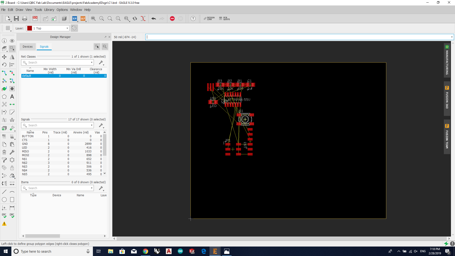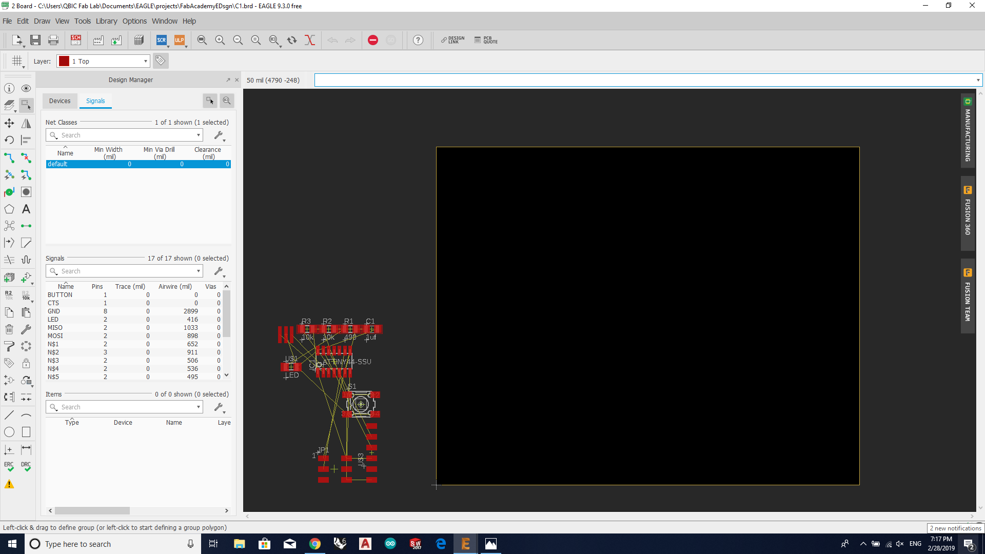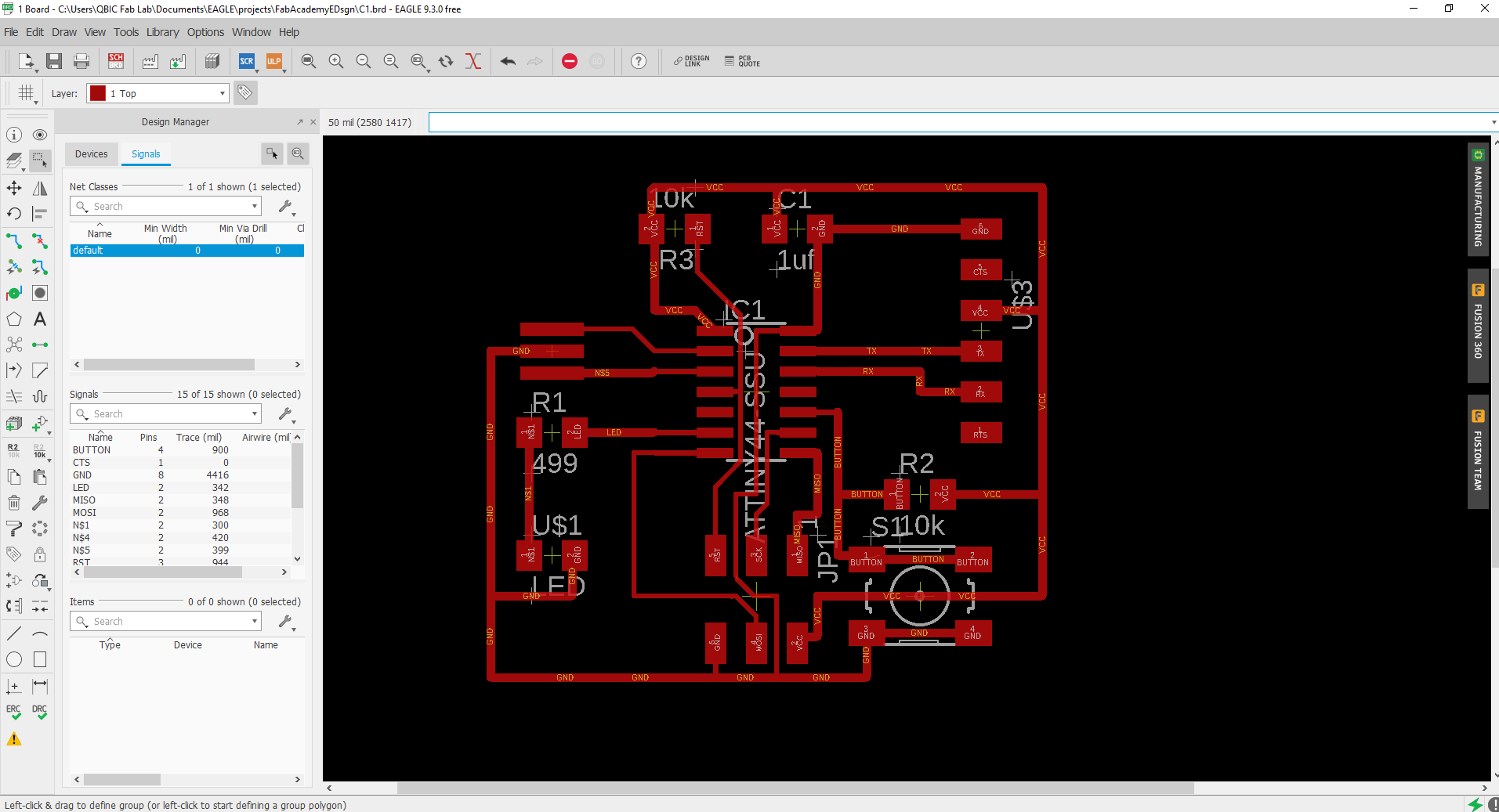 - when routing a trace, I made sure that it doesn't cross over other traces or too close to any other trace (clearance) because this might lead to problems such as short circuits when milling the board. (I learned this the hard way! :/ ).