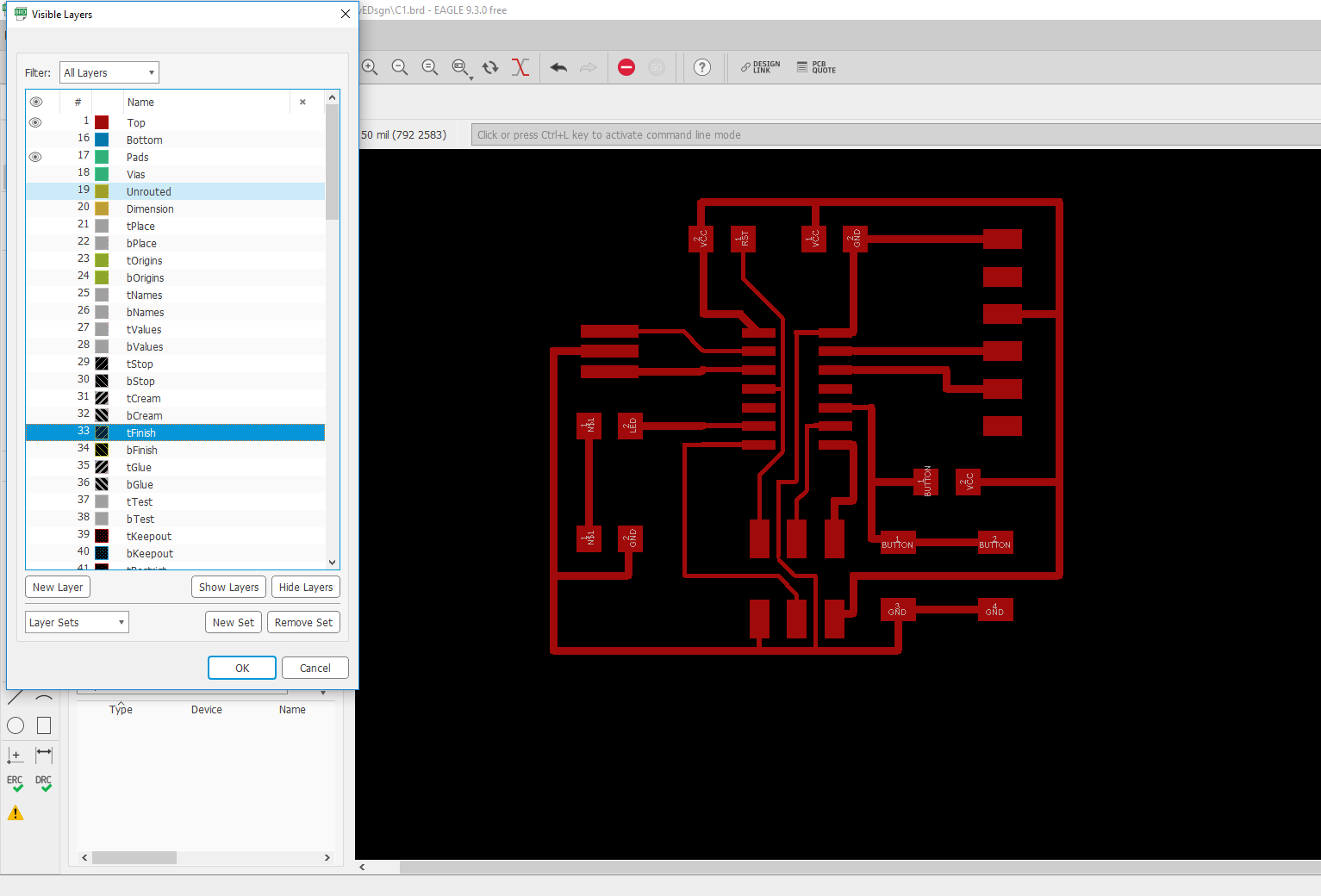 12- Now that everything looks fine, I prepared the board to be exported by going to the top toolbar then View > Layer settings > Select all layers > Hide layers > Select Top and Pads layers > Show layers > Ok