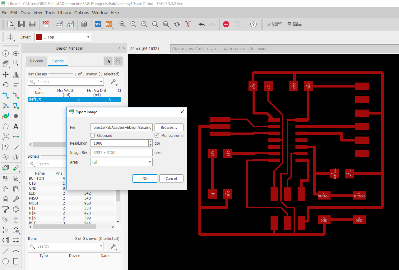 13- I exported the board by going to the top toolbar then File > Export > Image . Then, in the export window I did: Check Monochrome box > Set resolution to 1000 dpi > Set Area to full > Ok. The board design will be saved as png.
