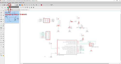 7- Once the schematic was completed, I genertated the PCB board using the "Generate/Switch to board" from the top toolbar. This will change the view to the PCB window in which the PCB layout can be designed, editied and finalized.