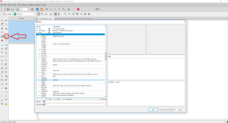 4- Since I have already created the schematic in step 2, I went ahead and added all the components needed for the "Echo Hello-World" board by going to "Add Part" tool from left toolbar > Select the fab library and selecting the compnents I wanted to add.