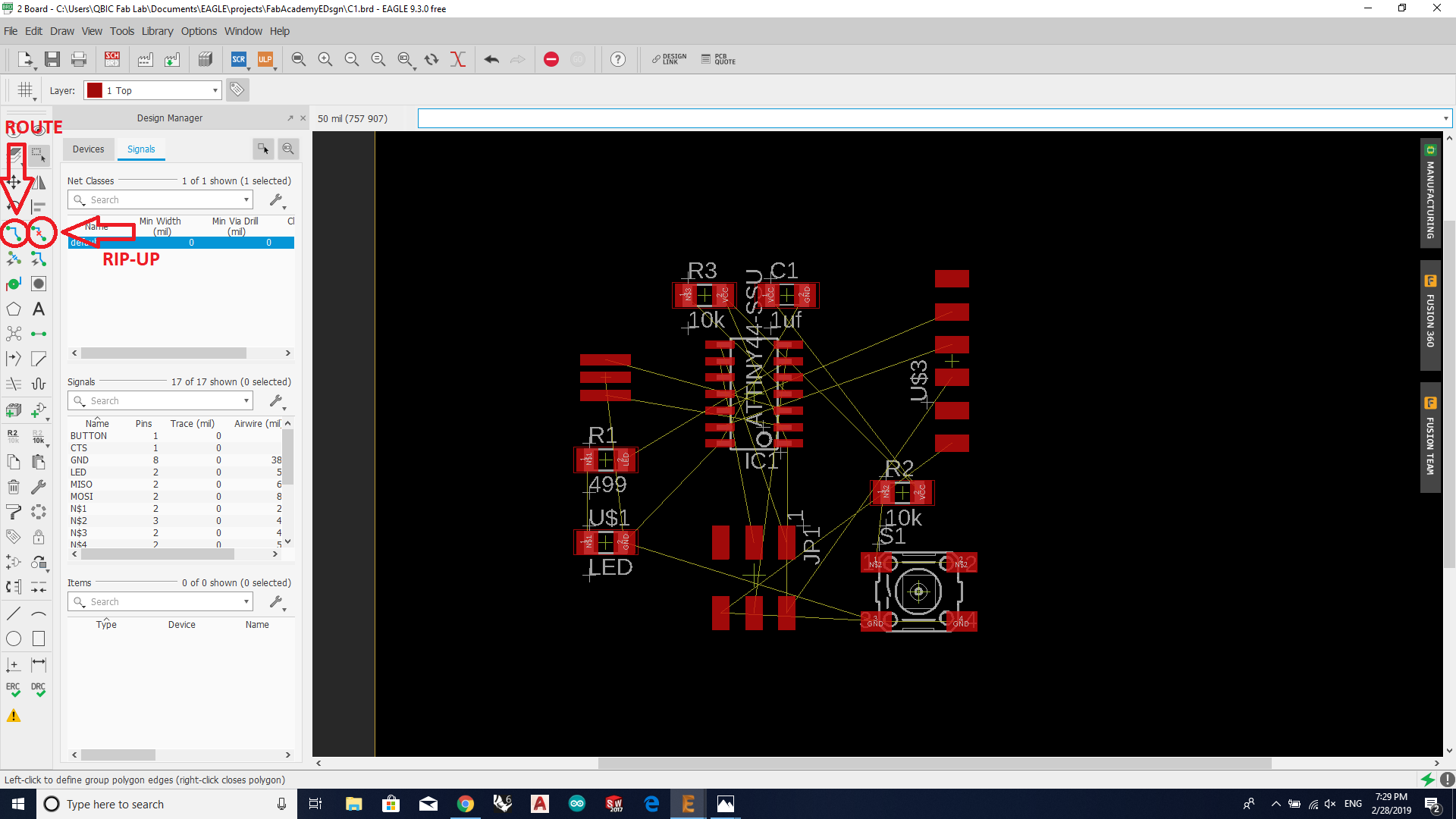 - Sometimes, I needed to edit a trace or redo it, so I used the "Ripup" tool from the left side toolbar to remove a trace or part of it.