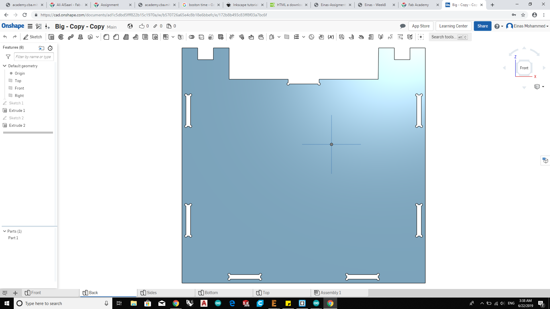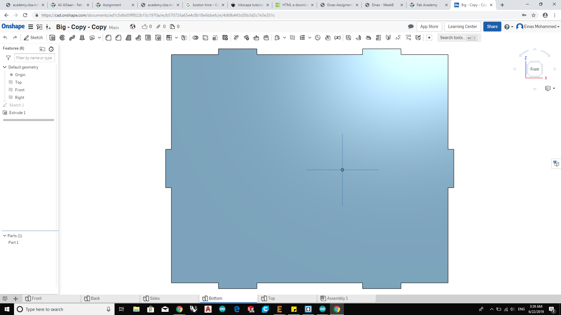 The bit of the ShopBot will affect the way the edges look especially sharp and 90deg edges. Thus, our instructor showed us how to do the T-bone design on sharp edges so that the machine cuts it more precisely and the slots would fit as planned.