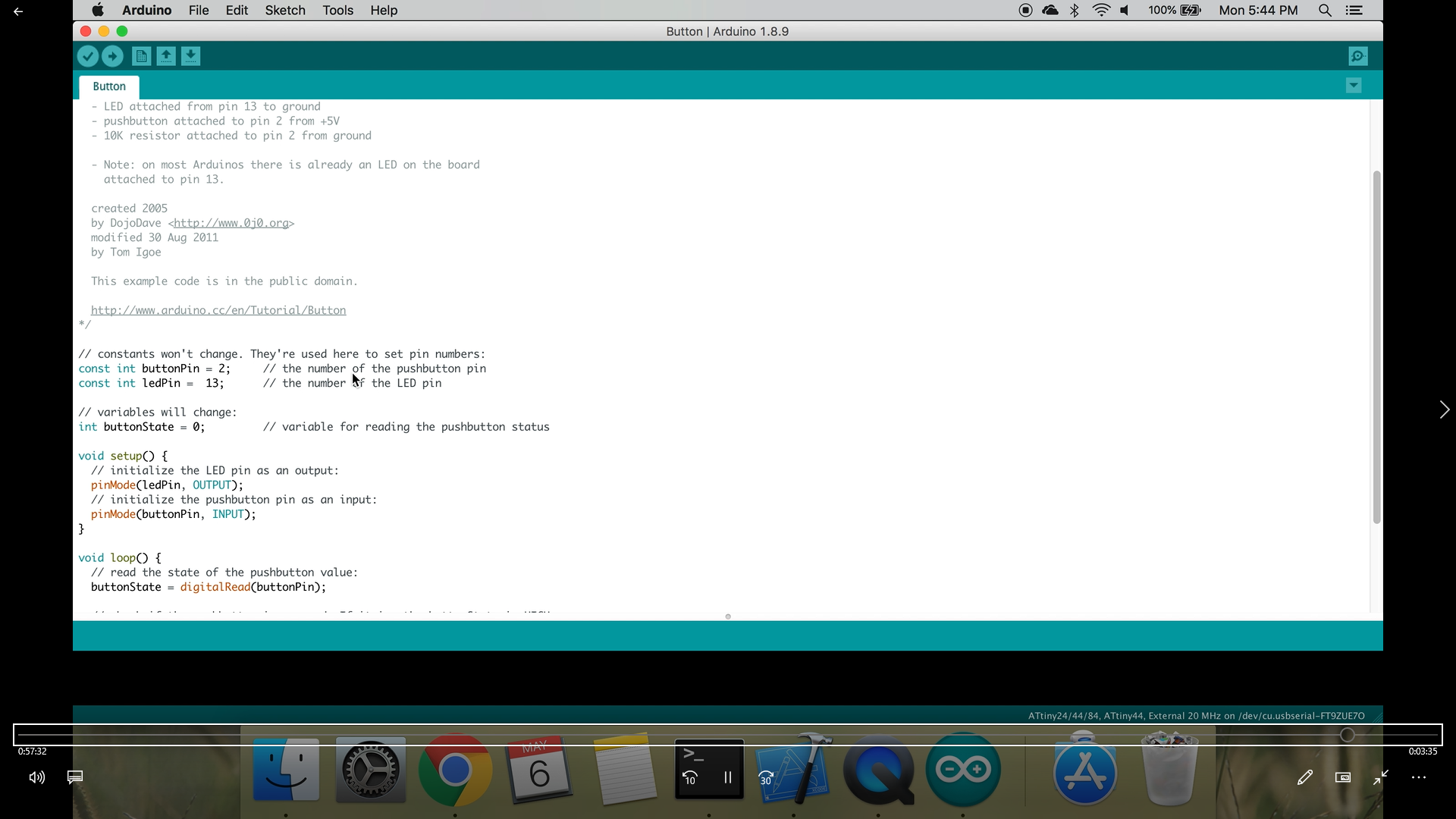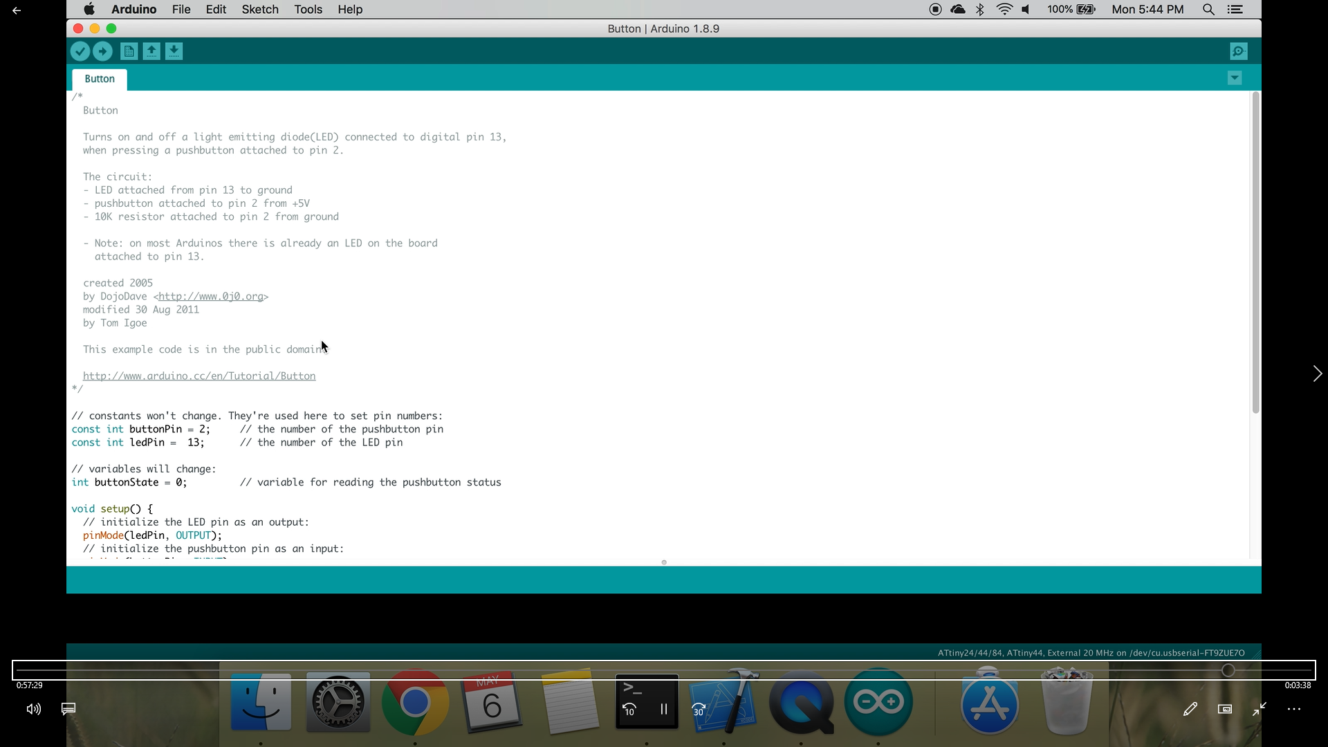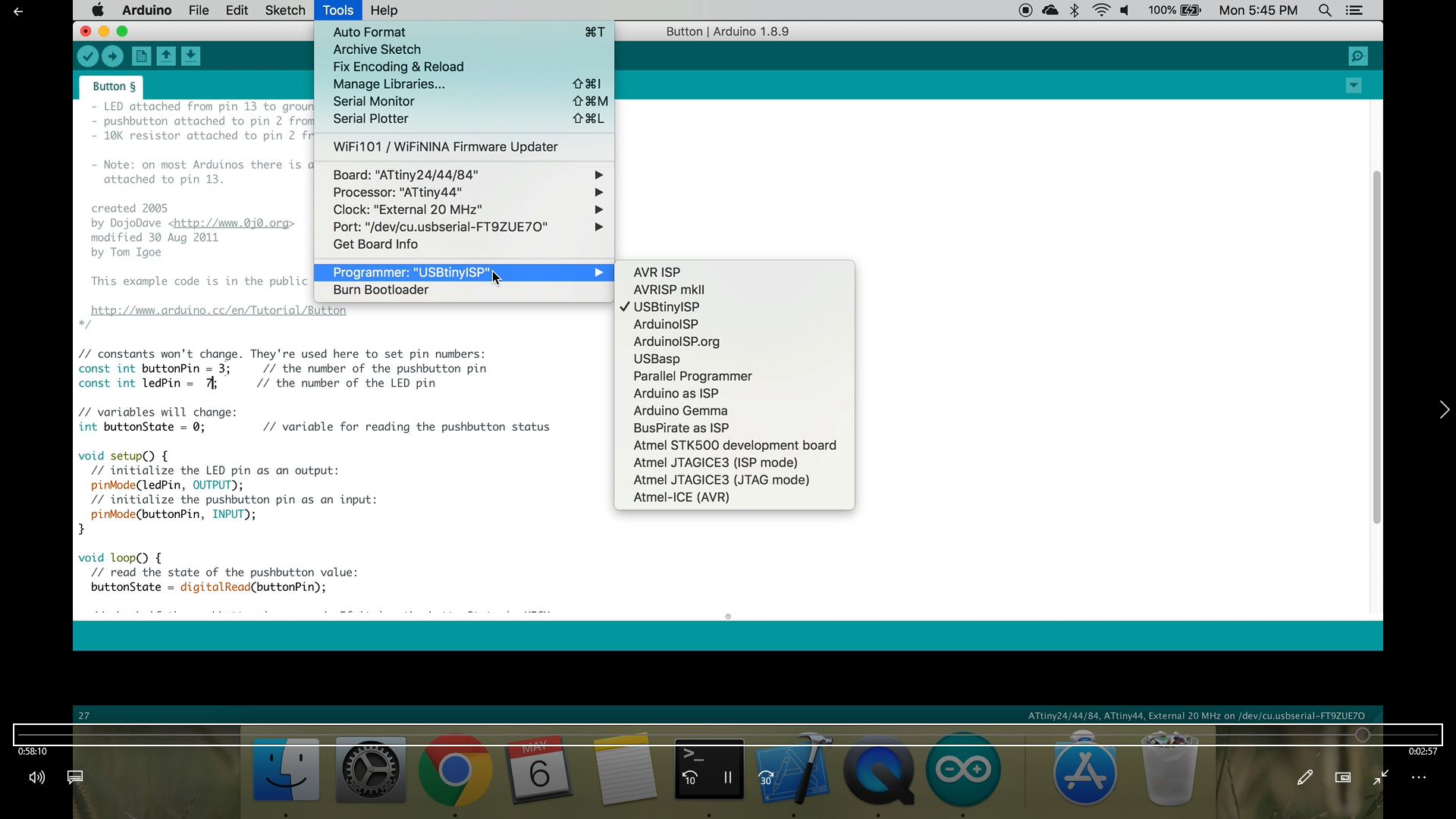 1- To program this board, I used the FABISP as my programmer. I opened Arduio IDE and opened the 'Button' example code
